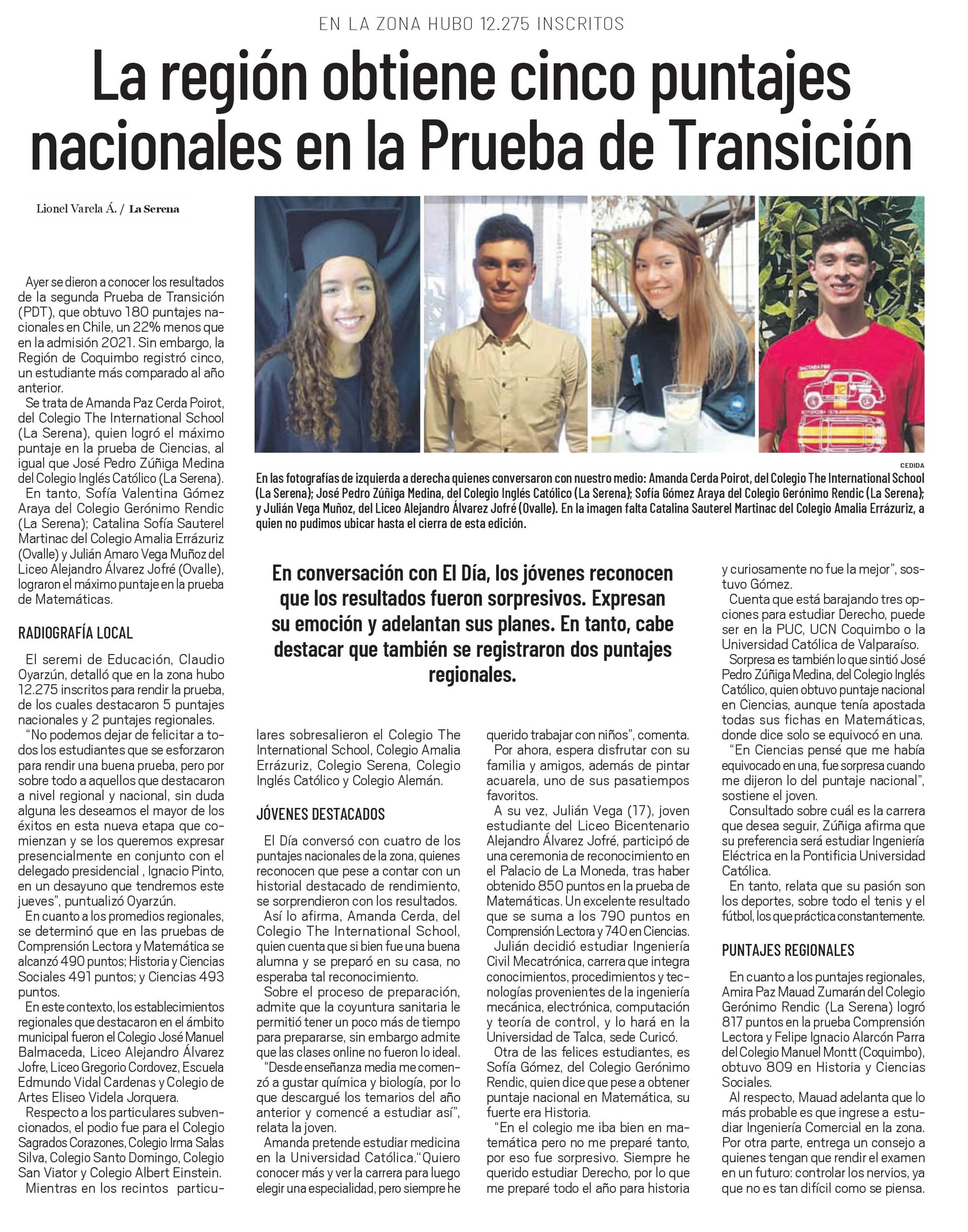 Joven ovallino entre los mejores puntajes en la prueba de transición. Se menciona a la UTalca.
