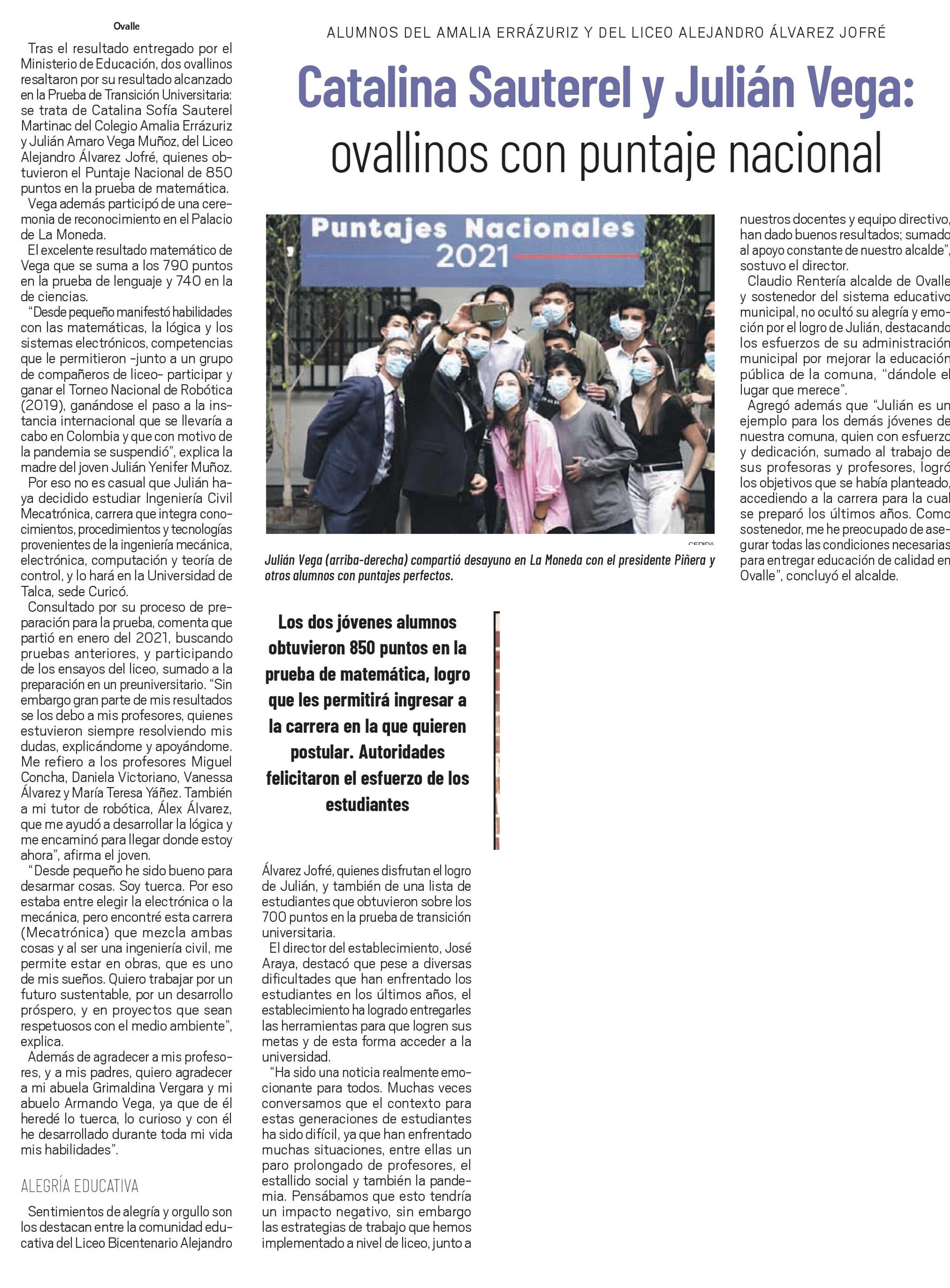 Catalina Sauterel y Julián Vega: ovallinos con puntaje nacional. Se menciona la UTalca.