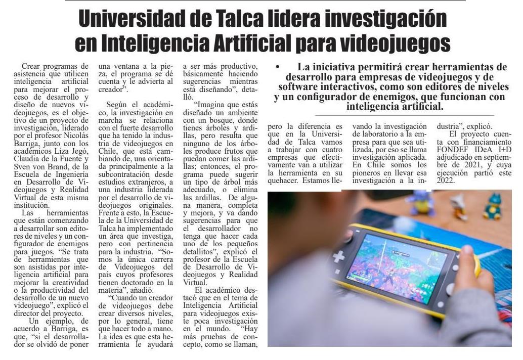 Universidad de Talca lidera investigación en Inteligencia Artificial para videojuegos.