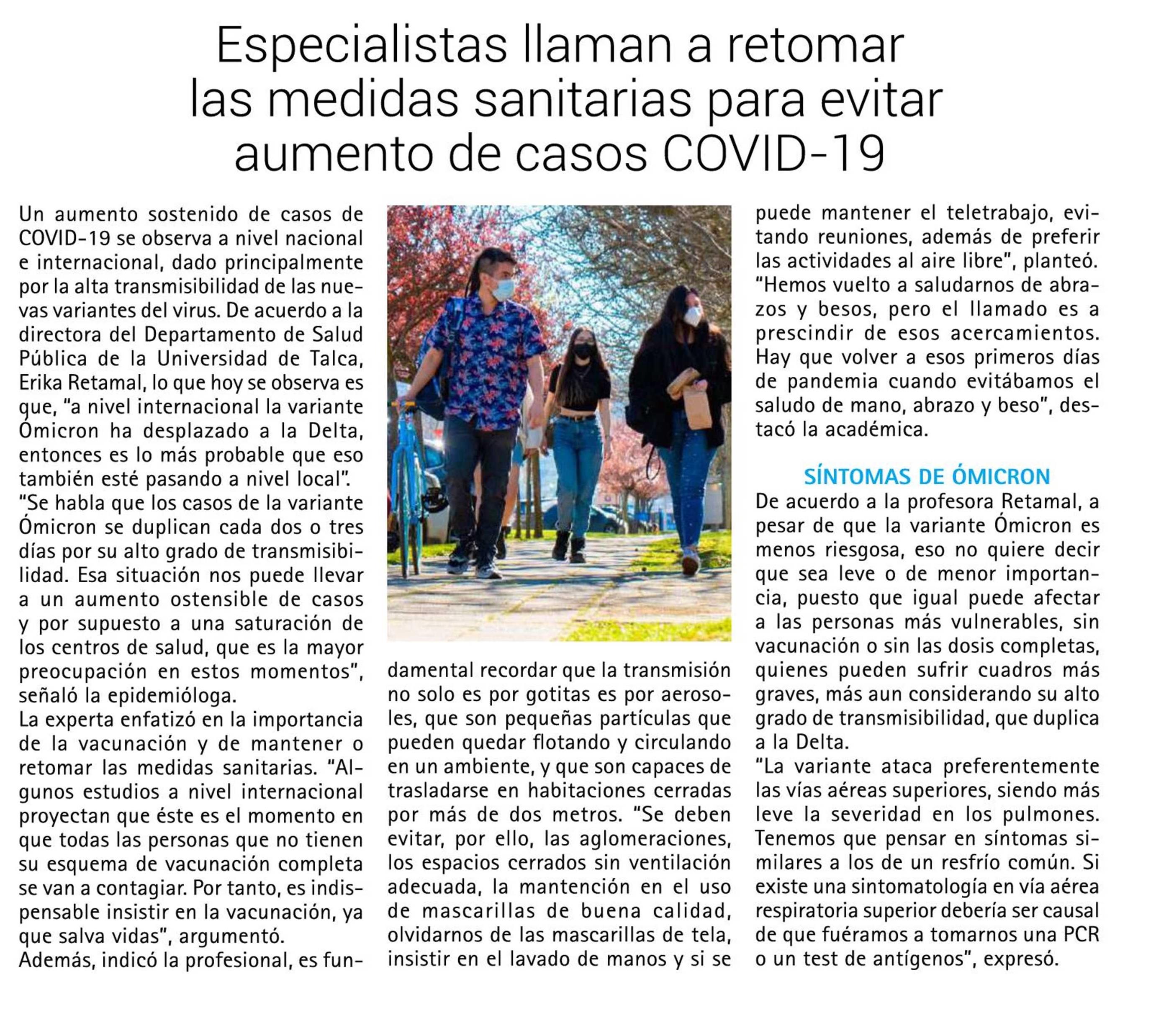 Especialistas llaman a retomar las medidas sanitarias para evitar aumento de casos COVID-19. Se refiere Erika Retamal, directora de Salud Pública de la UTalca.