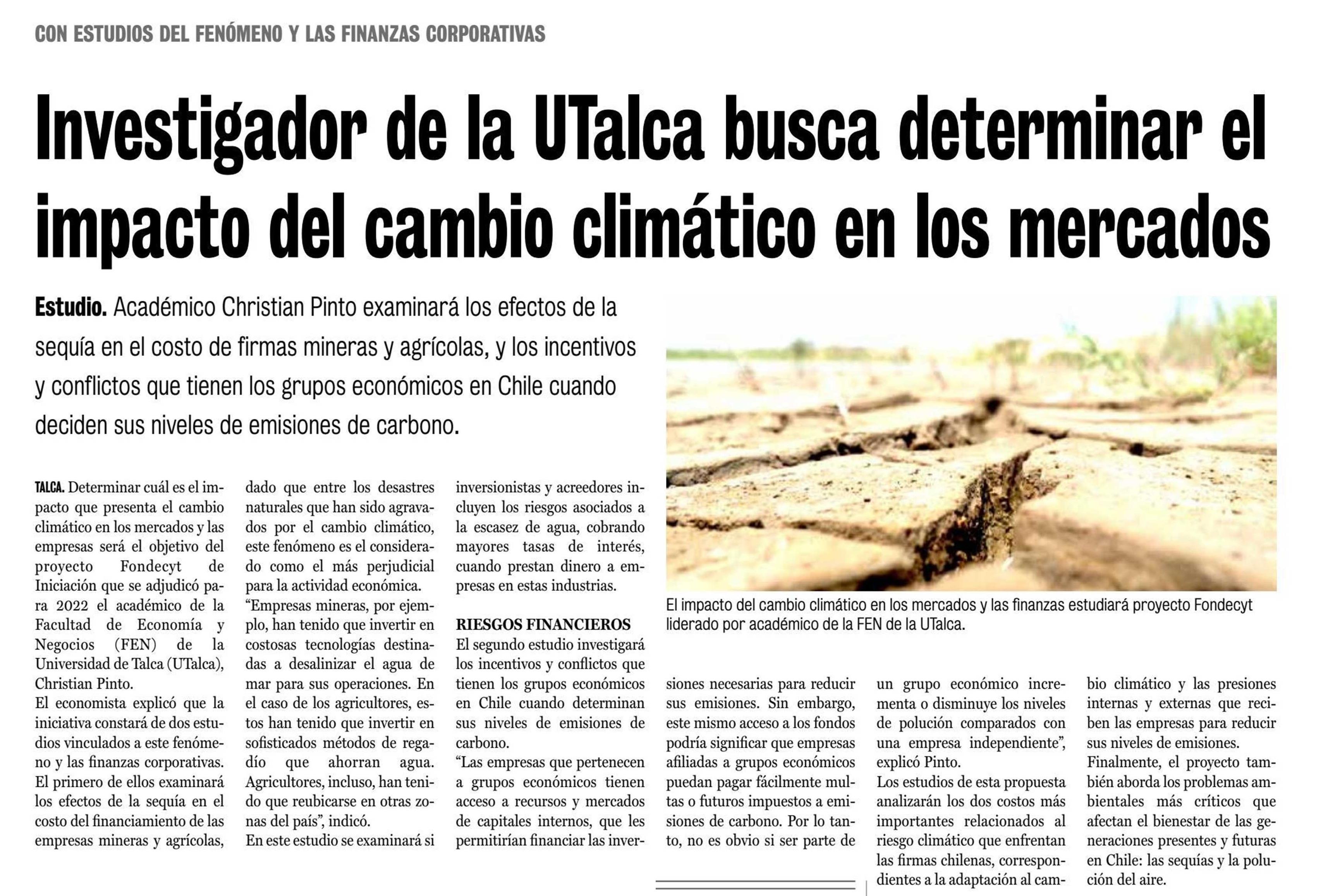 Investigador de la UTalca busca determinar el impacto del cambio climático en los mercados. Se refiere Christian Pino, académico de la Facultad de Economía y Negocios de la UTalca.