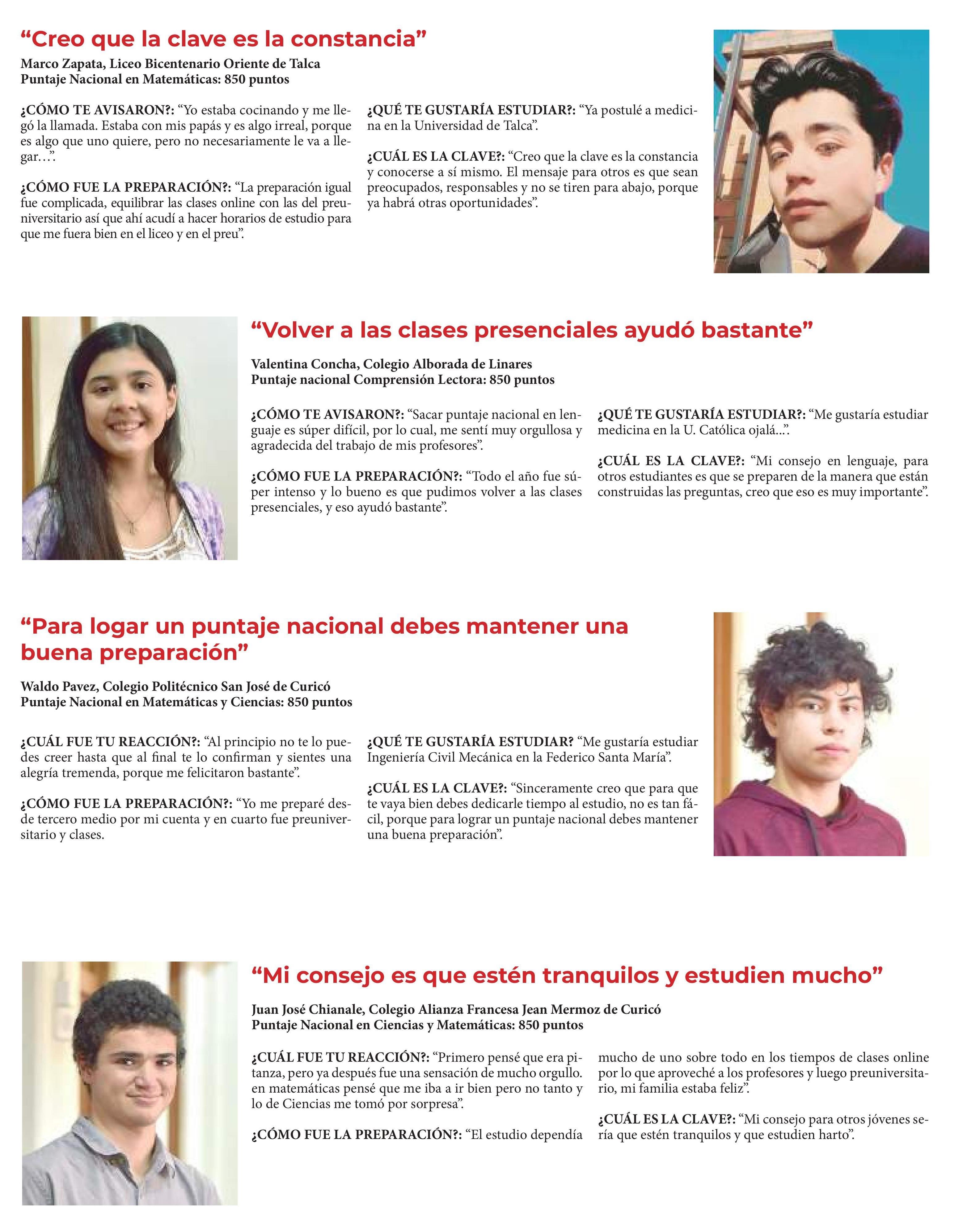 Estudiantes relatan cómo llegaron a ser puntajes máximos nacionales y regionales. Se menciona a la Universidad de Talca.