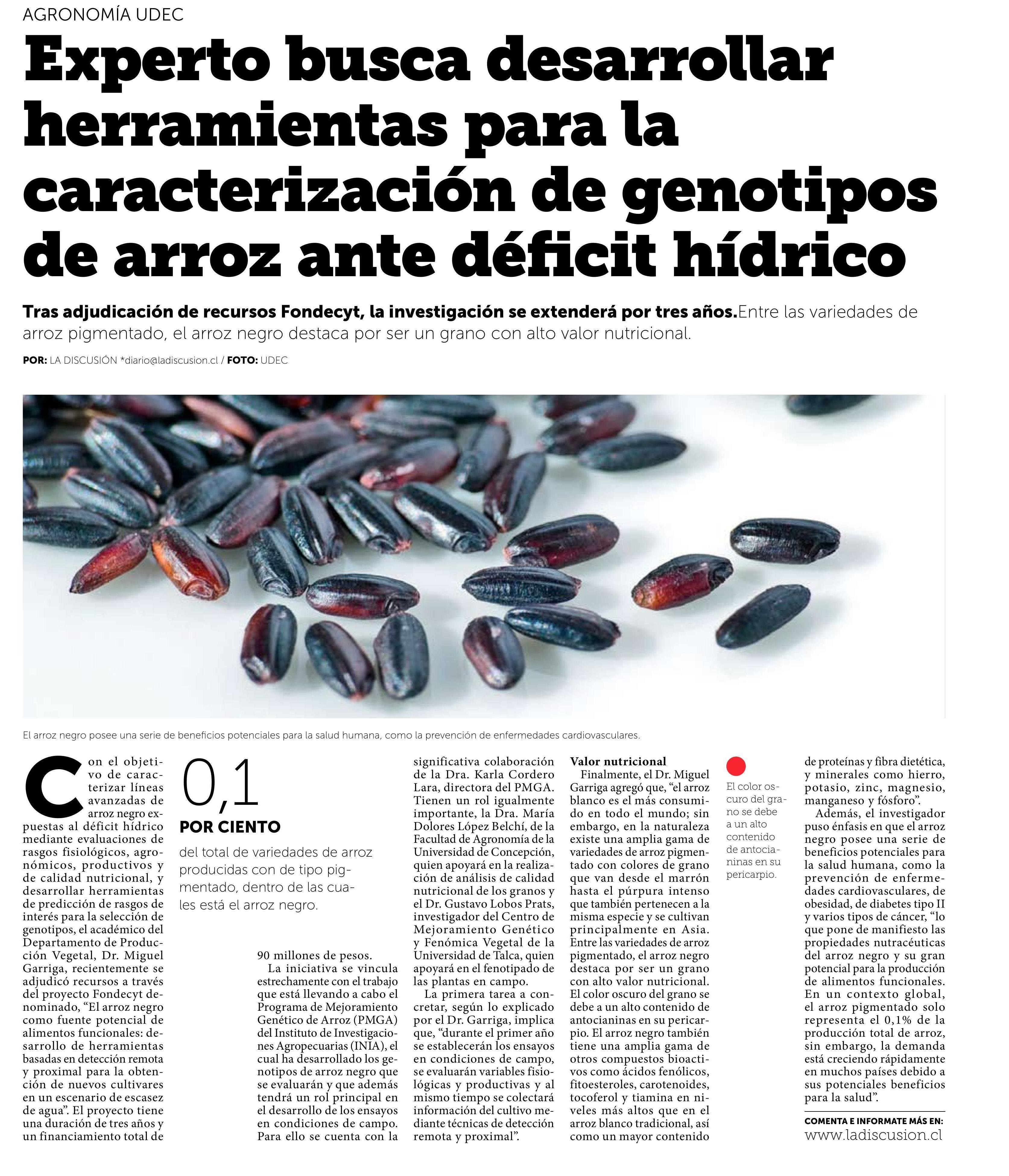 Experto busca desarrollar herramientas para la caracterización de genotipos de arroz ante déficit hídrico. Se menciona a Gustavo Lobos, investigador del Centro de Mejoramiento Genético y Fenómica Vegetal de la UTalca.
