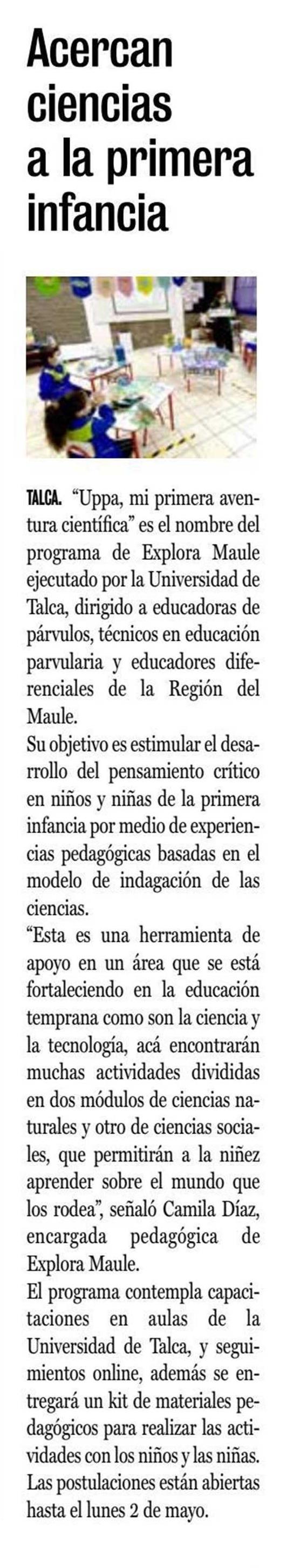 Acercan ciencias a la primera infancia. Se refiere Camila Díaz, encargada pedagógica Explora Maule.