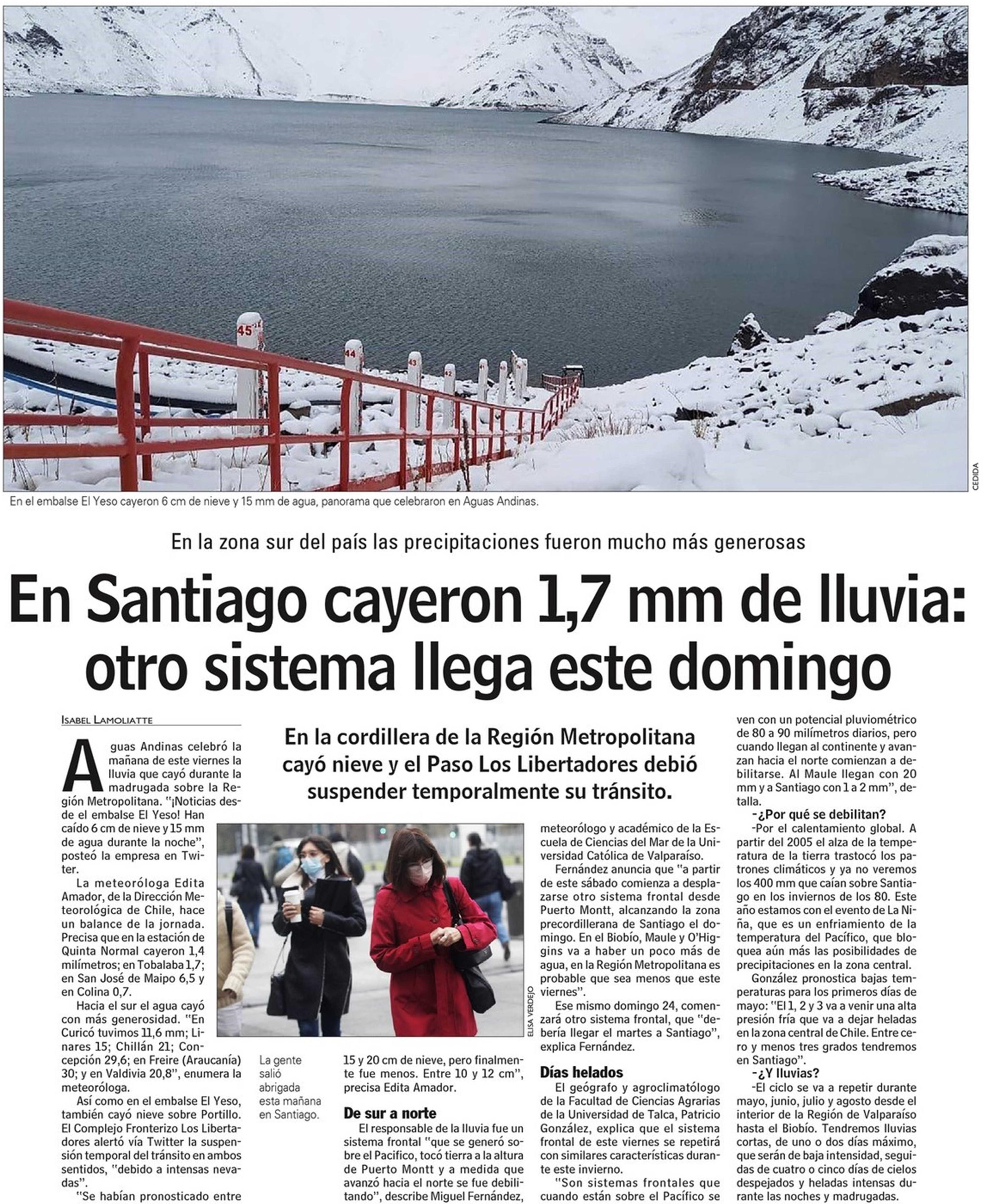 En Santiago cayeron 1,7 mm de lluvia: otro sistema llega este domingo. Se refiere Patricio González, académico del Centro de Investigación y Transferencia en Riego Y Agroclimatología (CITRA).