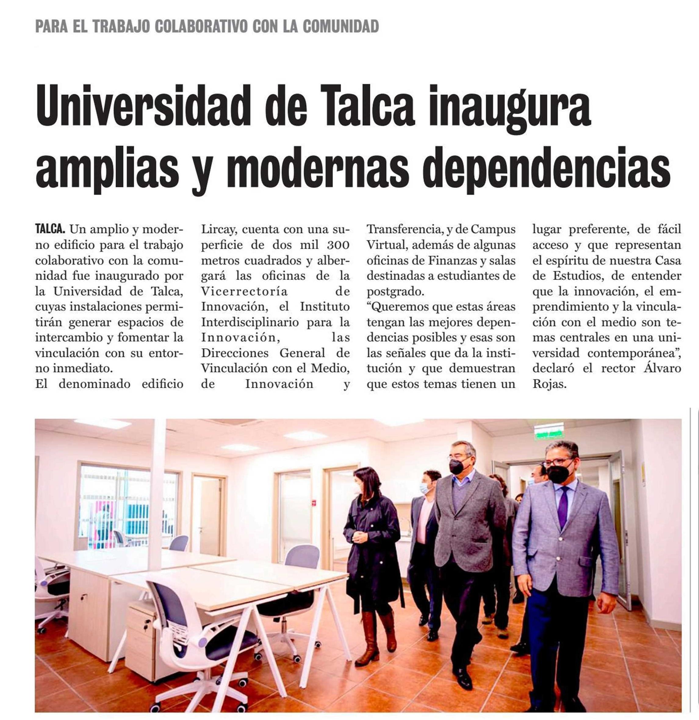 UTalca inaugura nuevo edificio institucional con espacios de trabajo para la comunidad.