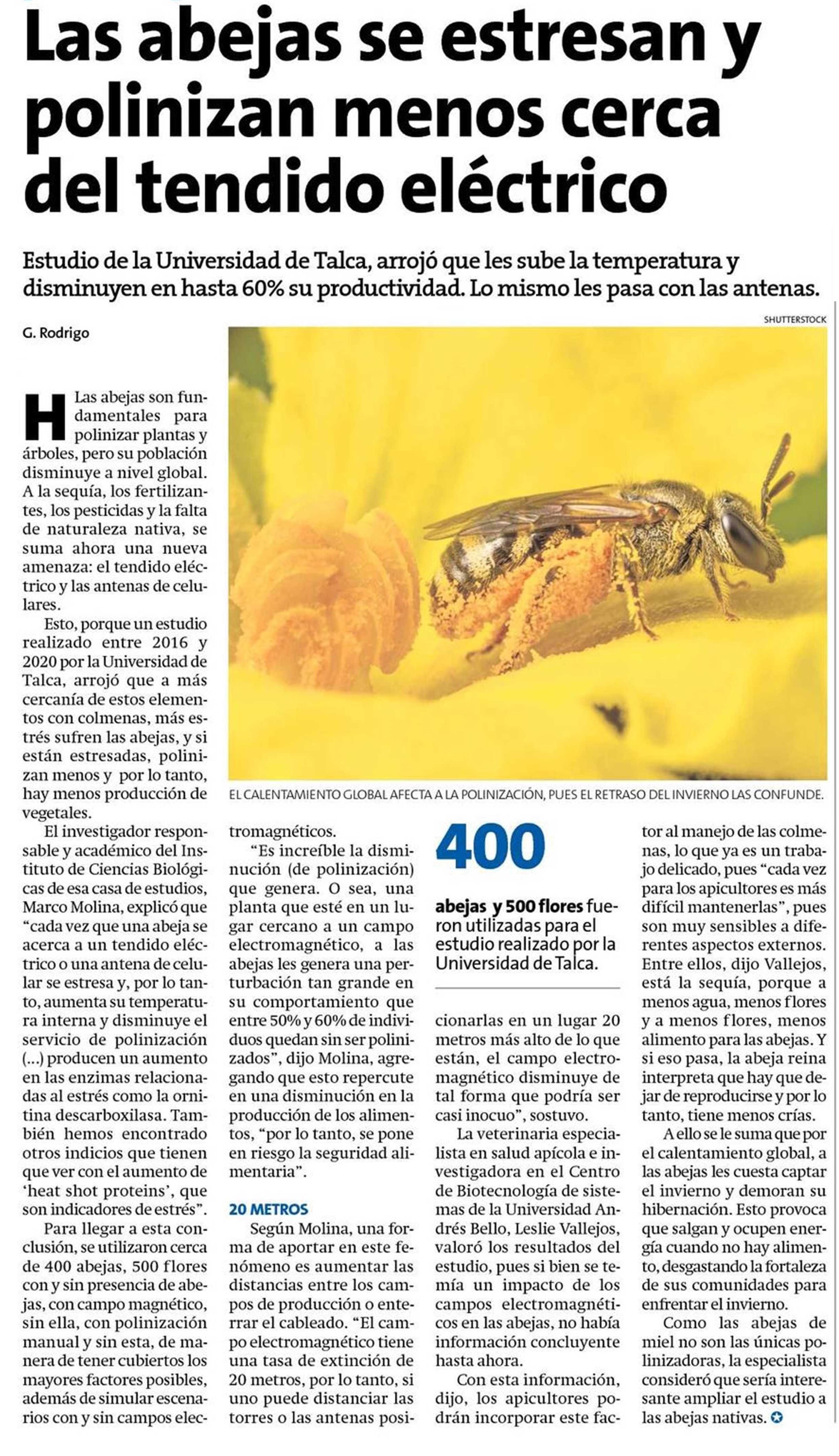 Las abejas se estresan y polinizan menos cerca del tendido eléctrico.