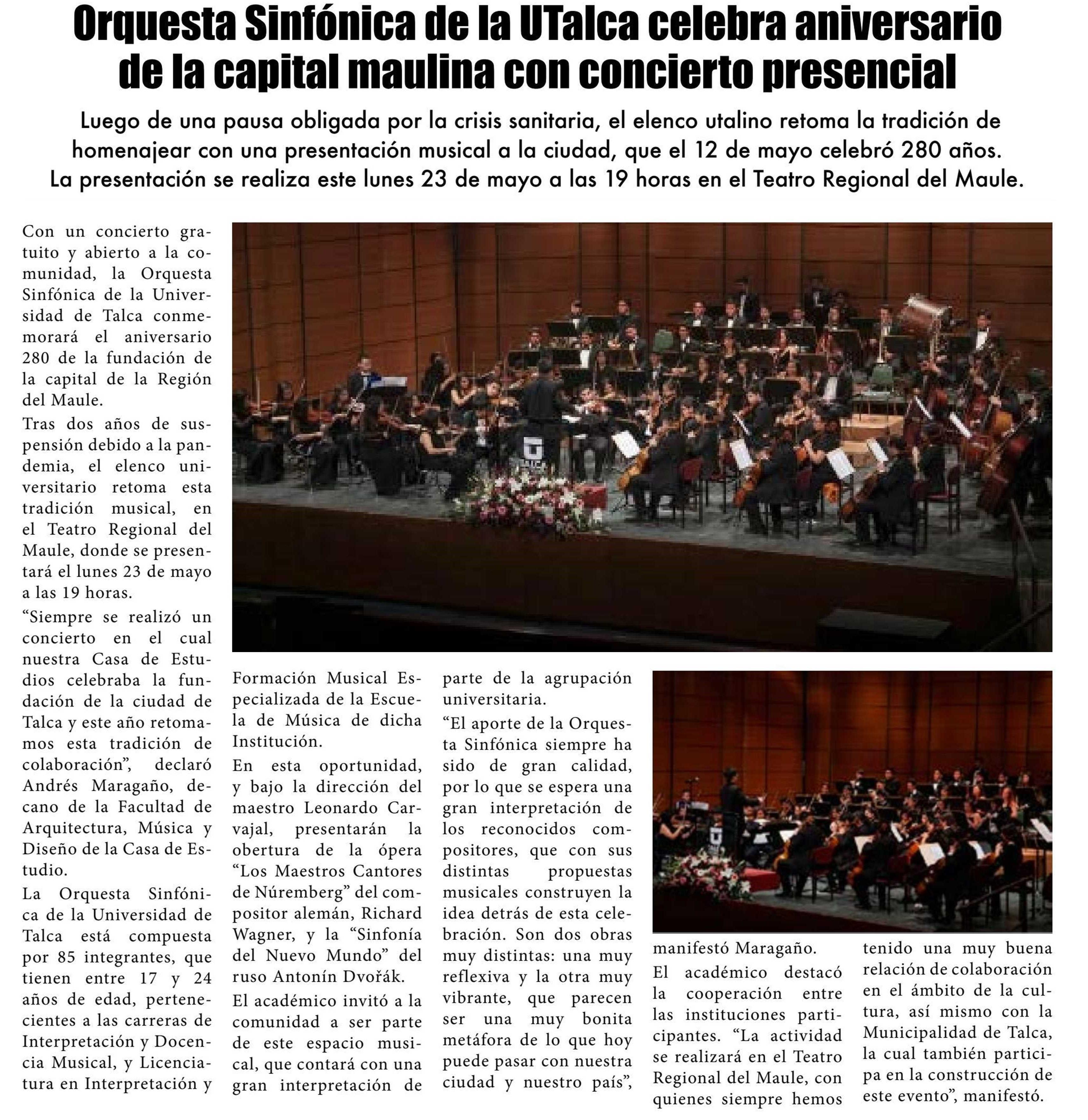 Orquesta Sinfónica de la UTalca celebra aniversario de la capital maulina con concierto presencial.