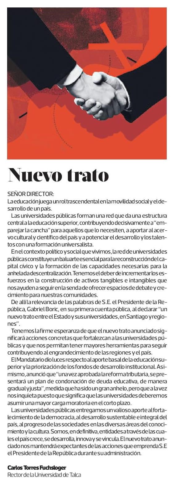 Nuevo trato. Se refiere Carlos Torres, rector de la UTalca.