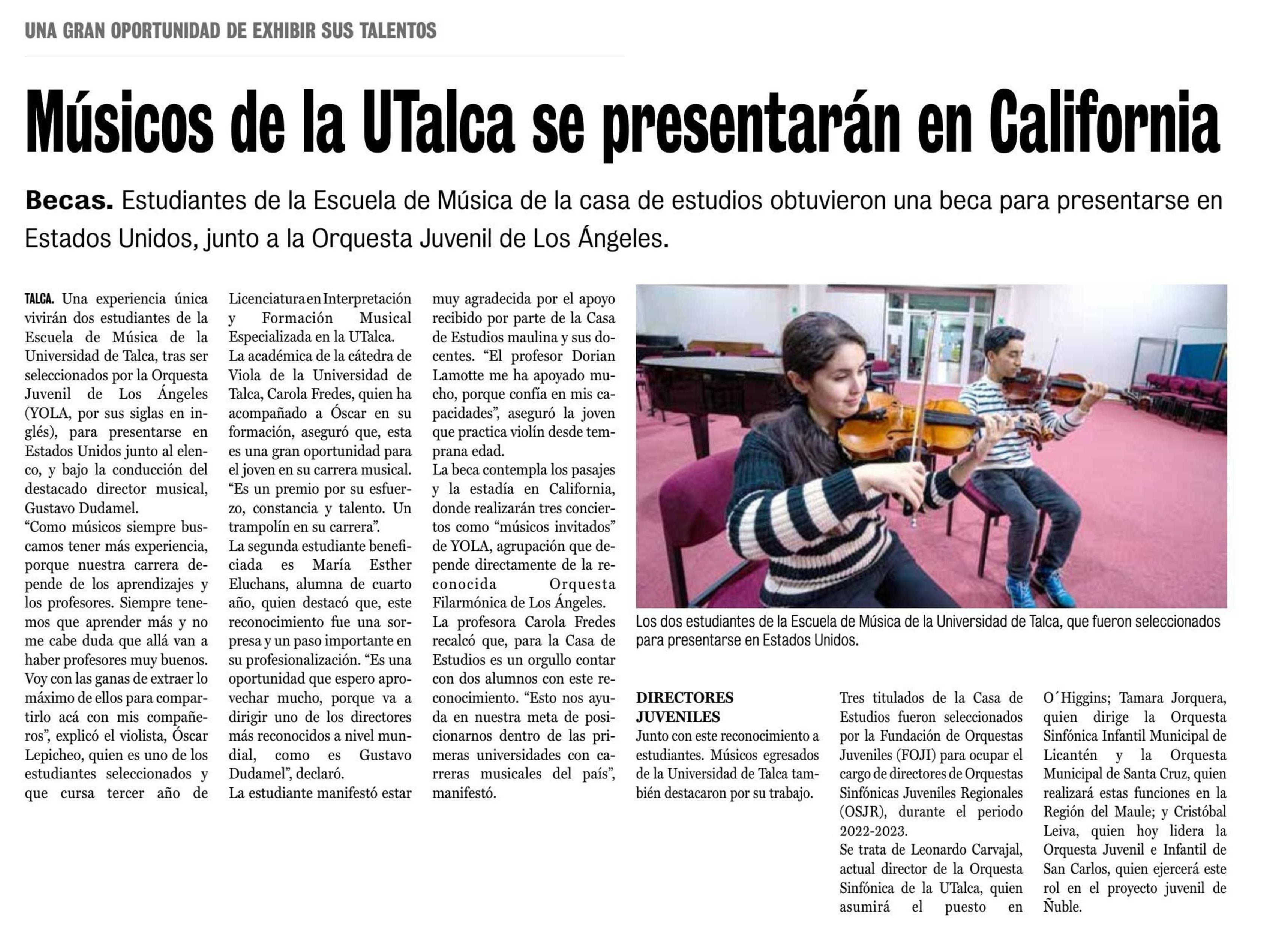 Músicos de la UTalca se presentarán en California.