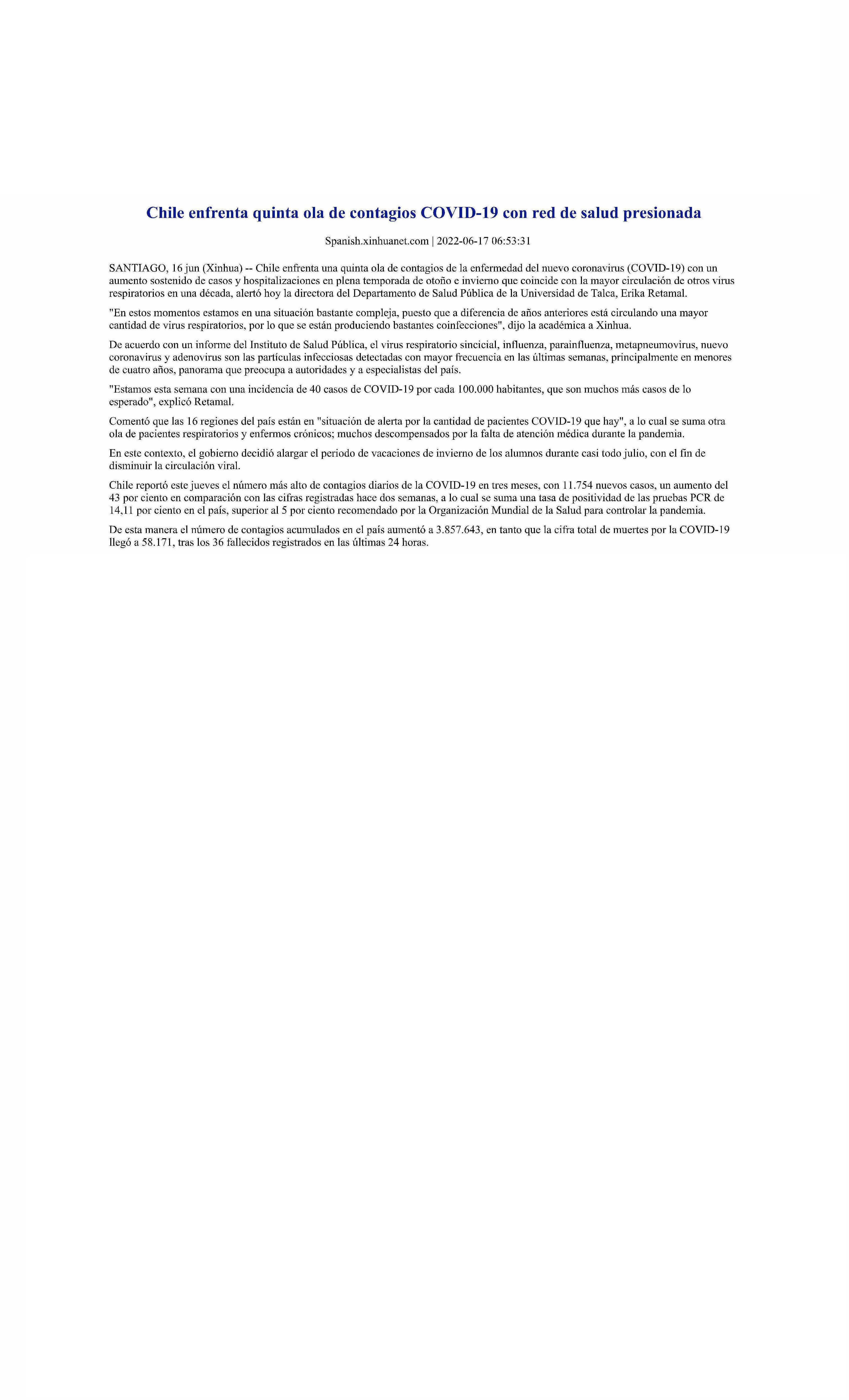 Chile enfrenta quinta ola de contagios COVID 19 con red de salud presionada.