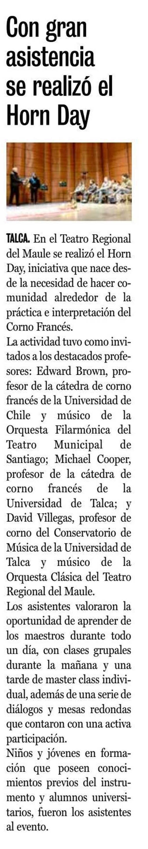 Con gran asistencia se realizó el Horn Day. Se mencionan a Michael Cooper y David Villegas, académicos de la Escuela de Música.