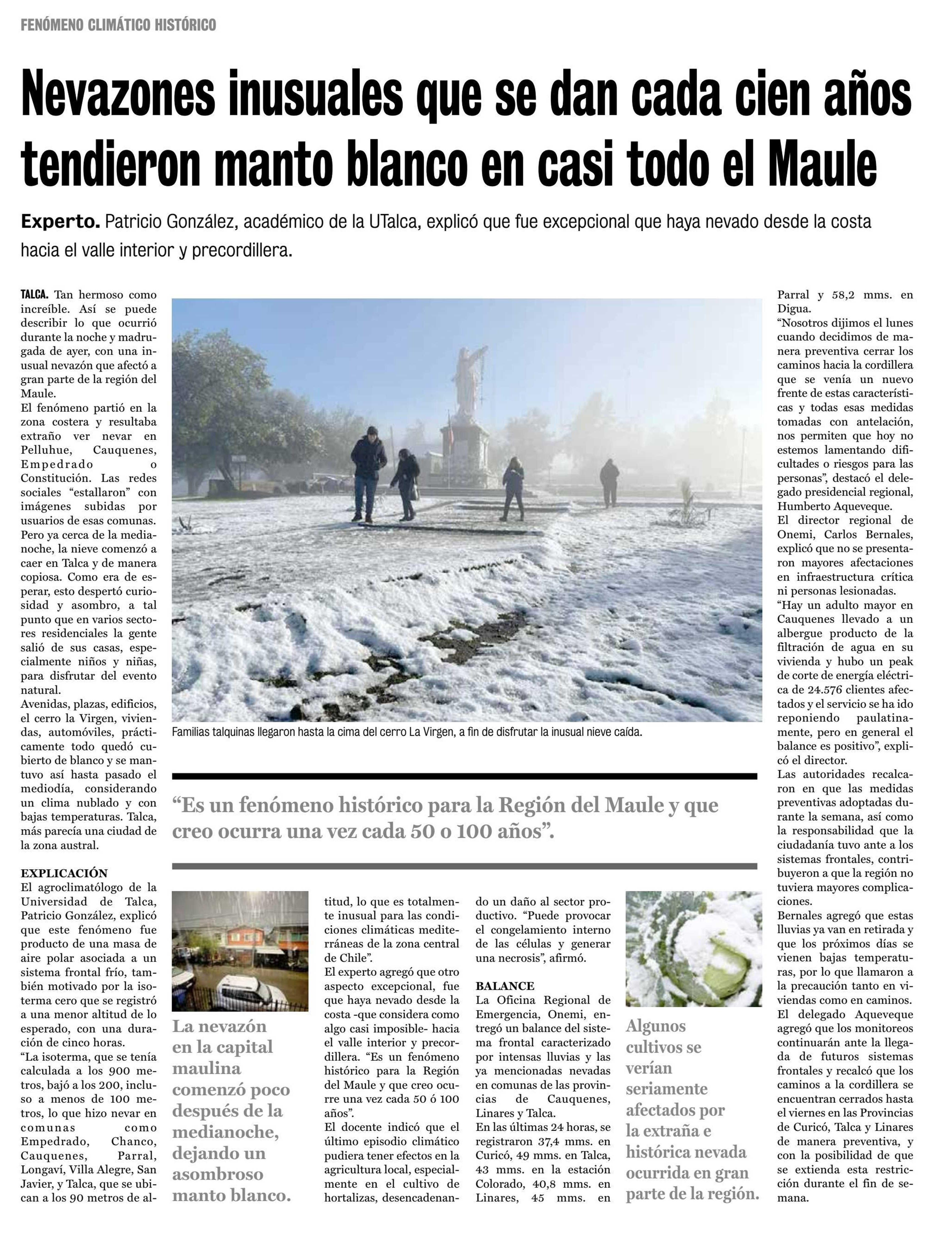 Nevazones inusuales que se dan cada cien años tendieron manto blanco en casi todo el Maule. Se refiere Patricio González, académico del Centro de Investigación y Transferencia en Riego y Agroclimatología (CITRA).
