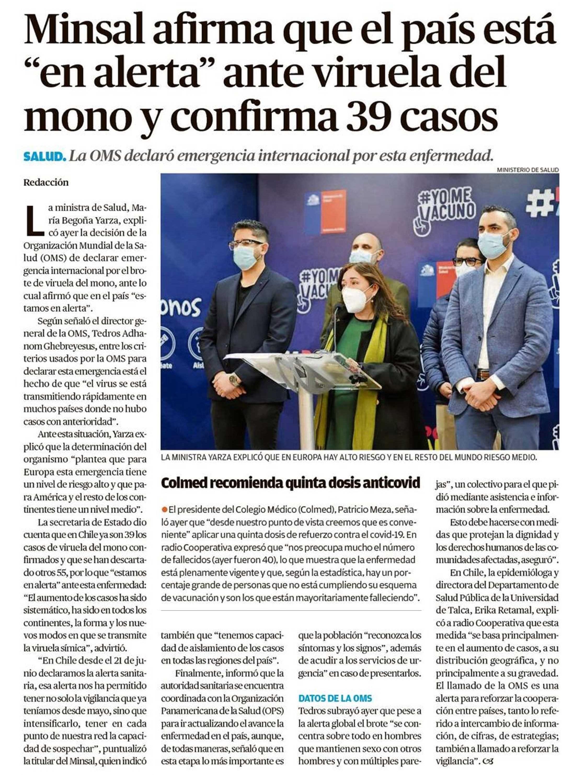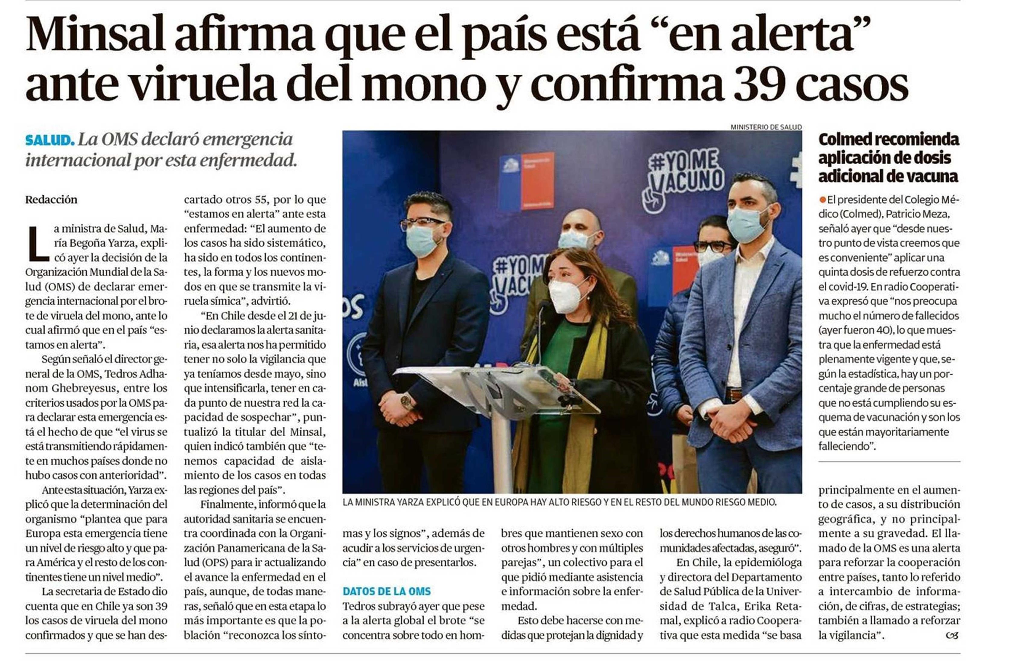 OMS decreta emergencia de salud internacional por la expansión de la viruela del mono. Se refiere Érika Retamal, directora del Departamento de Salud Pública.