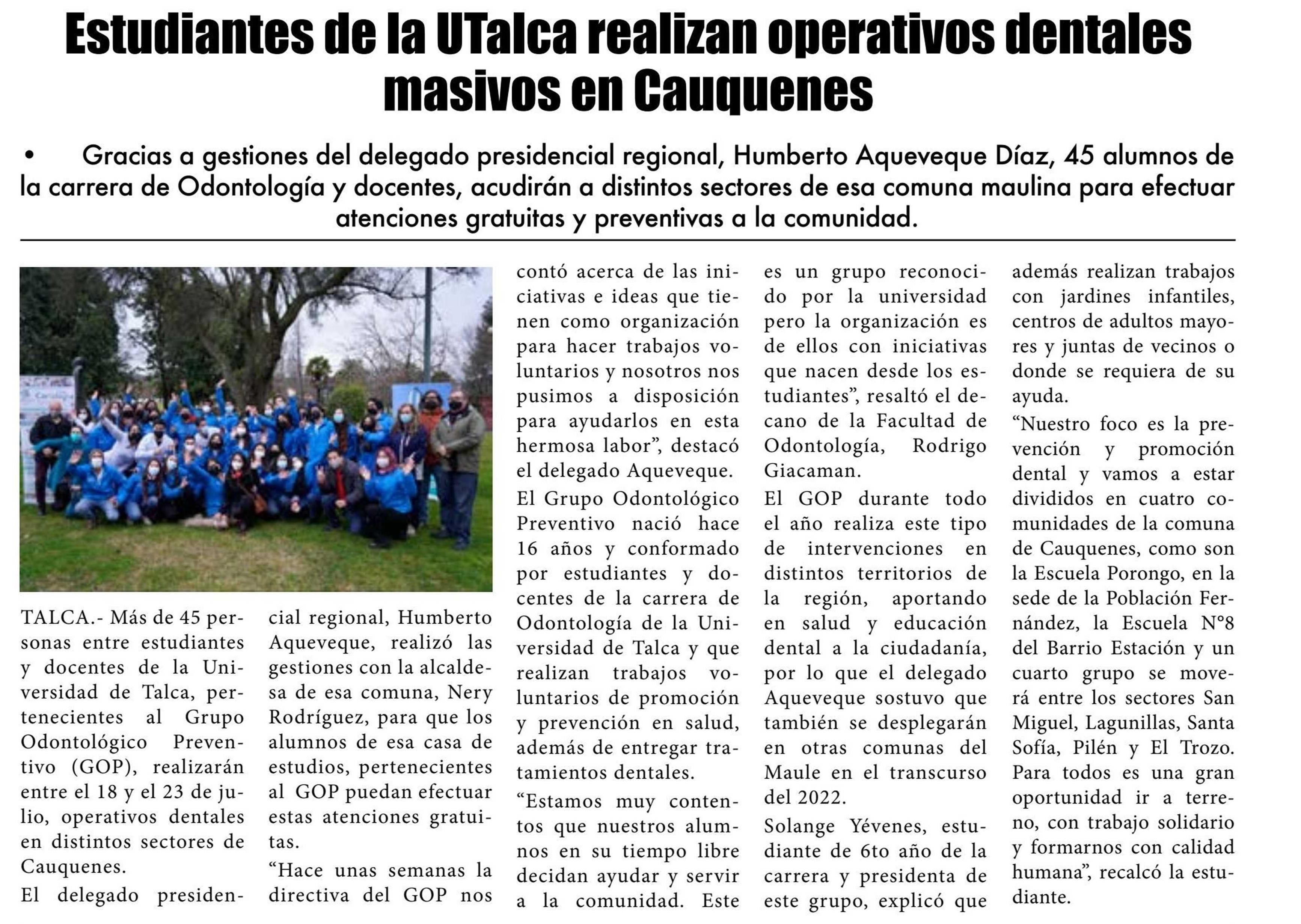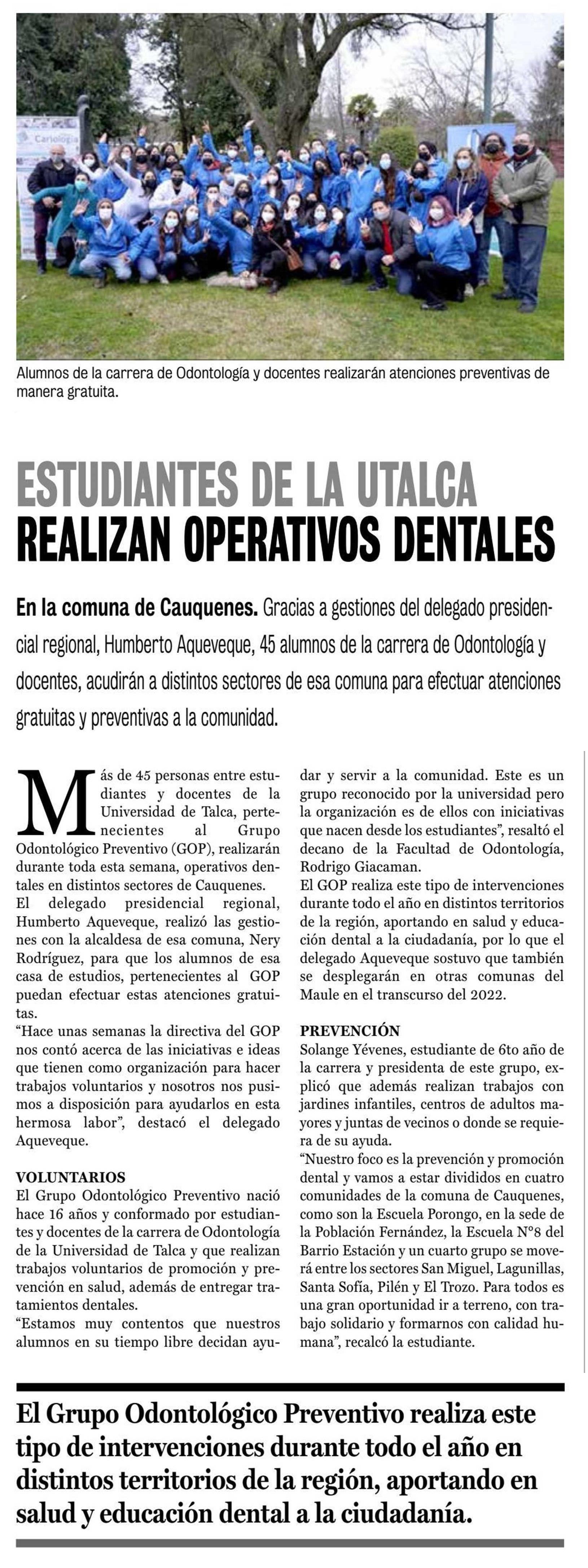 Estudiantes de la UTalca realizan operativos dentales masivos en Cauquenes. Se menciona al Grupo Odontológico Preventivo (GOP).