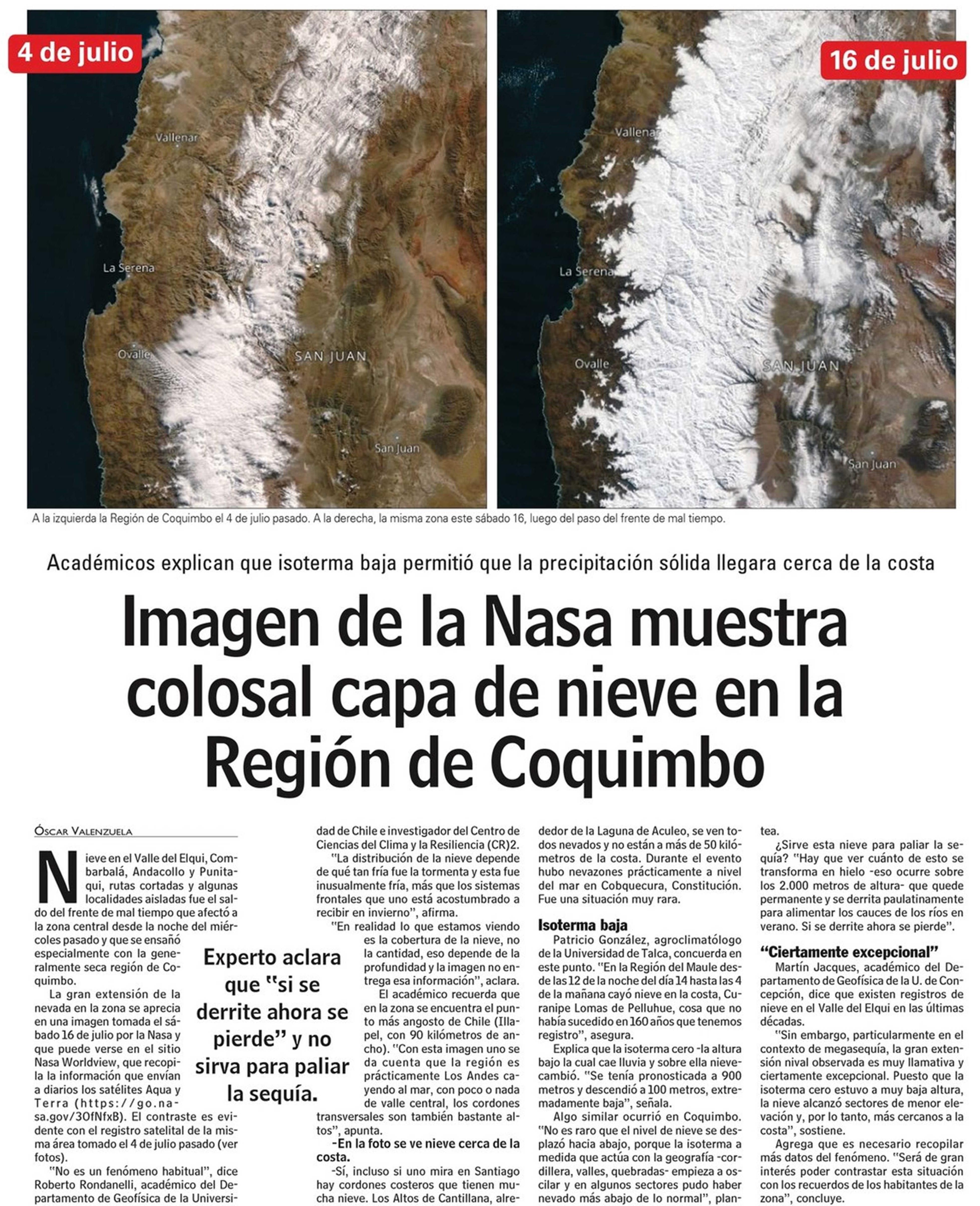 Imagen de la Nasa muestra colosal capa de nieve en la Región de Coquimbo. Se refiere Patricio González, académico del Centro de Investigación y Transferencia en Riego y Agroclimatología (CITRA).