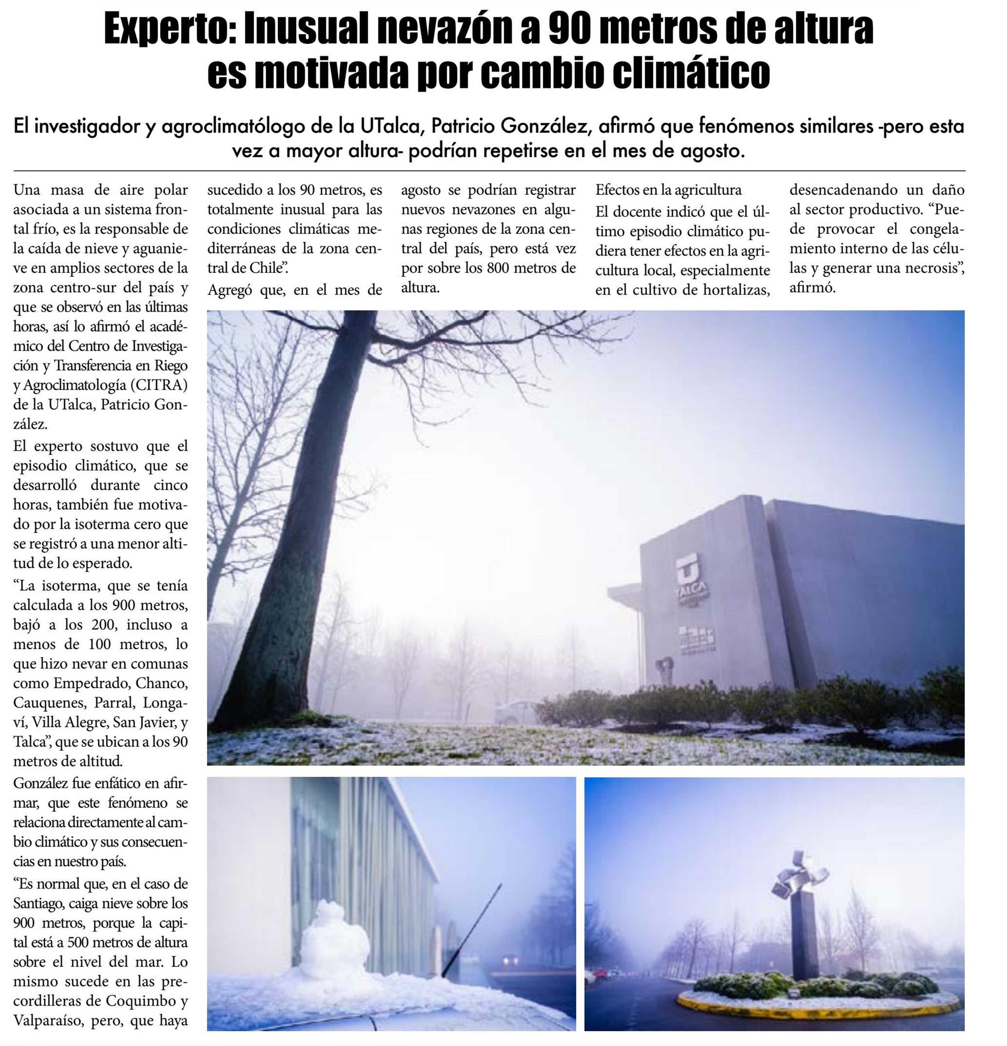 Experto: Inusual nevazón a 90 metros de altura es motivada por cambio climático. Se refiere Patricio González, académico del Centro de Investigación y Transferencia en Riego y Agroclimatología (CITRA).