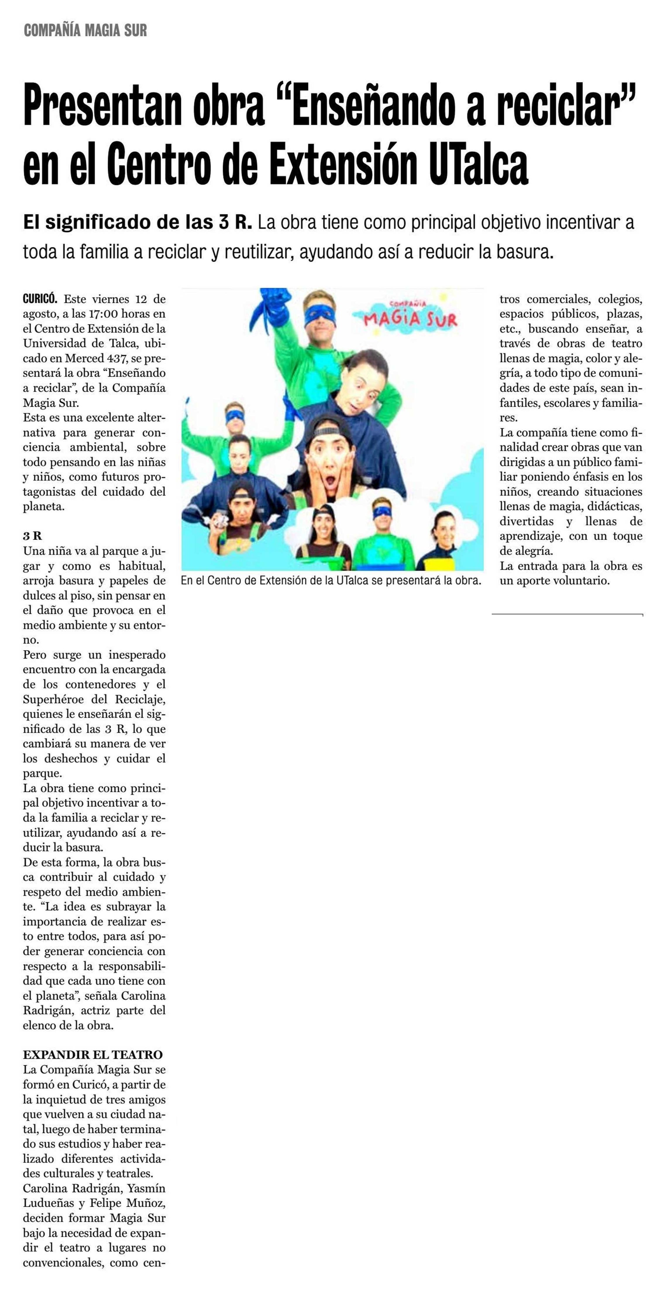 Presentan obra “Enseñando a reciclar” en el Centro de Extensión Curicó de la UTalca.