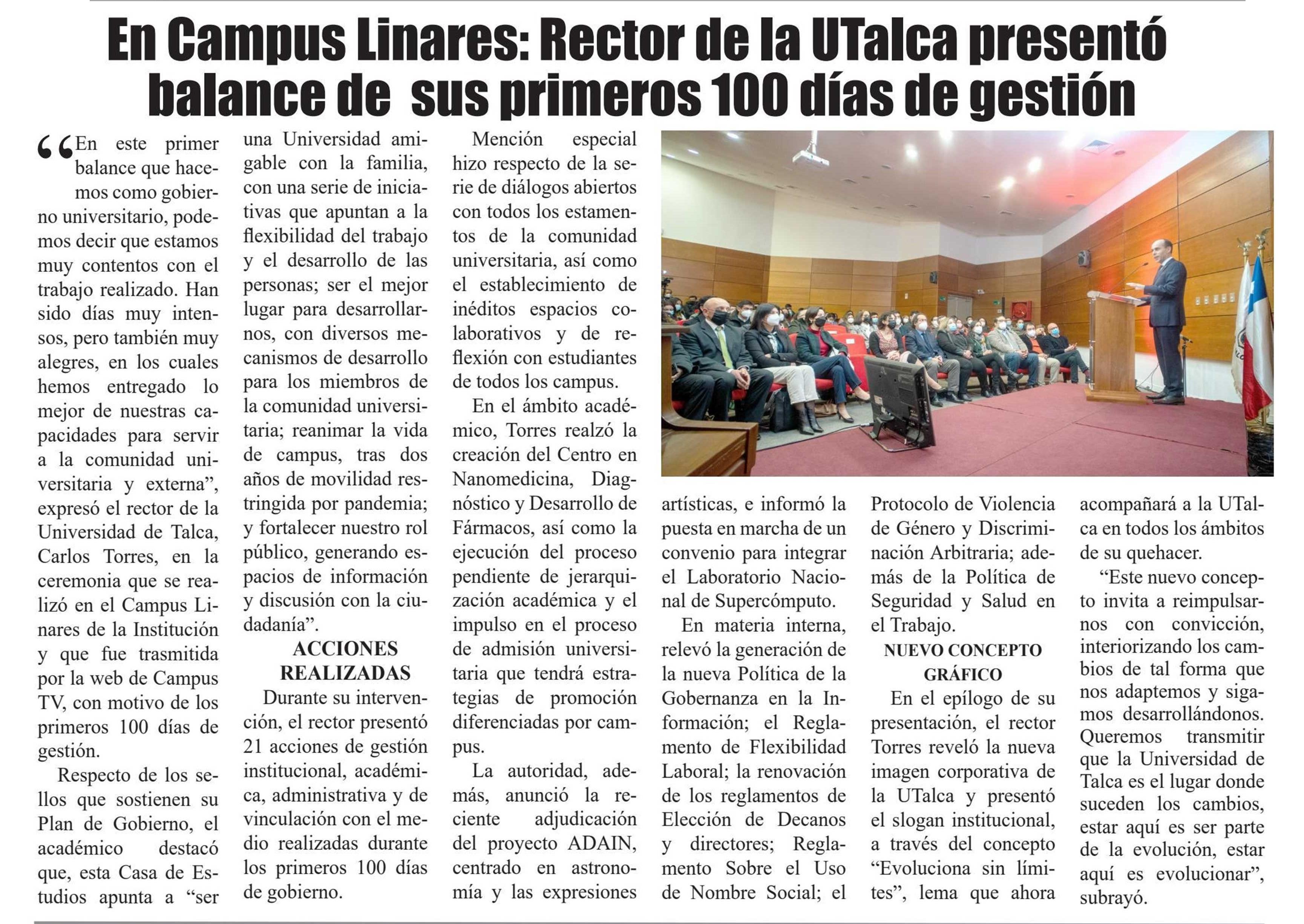 Rector de la UTalca presentó balance de sus primeros 100 días de gestión.