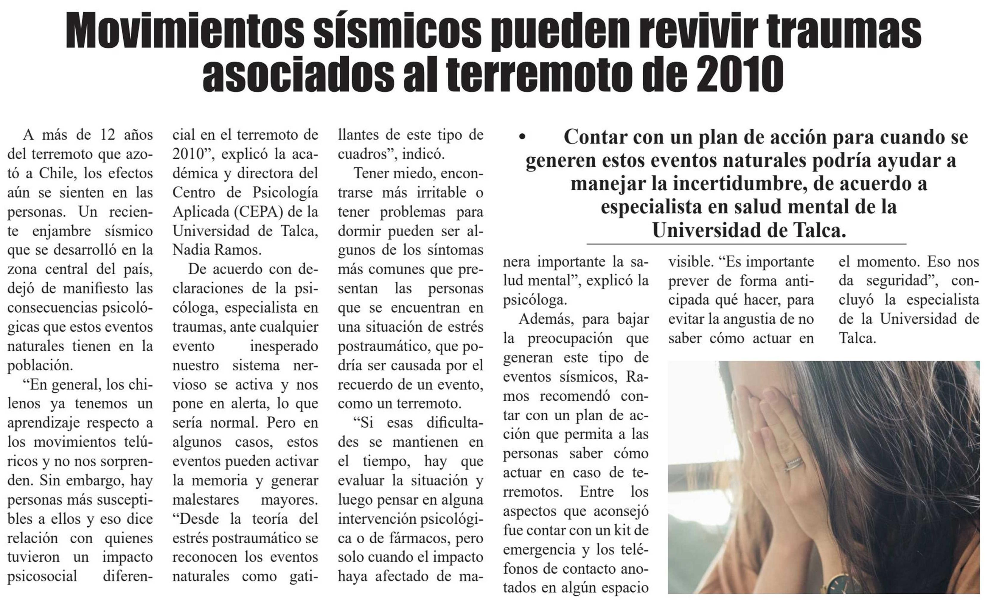 Académica U. de Talca: Movimientos sísmicos pueden revivir traumas asociados al terremoto de 2010. Se refiere Nadia Ramos, directora del Centro de Psicología Aplicada (CEPA).