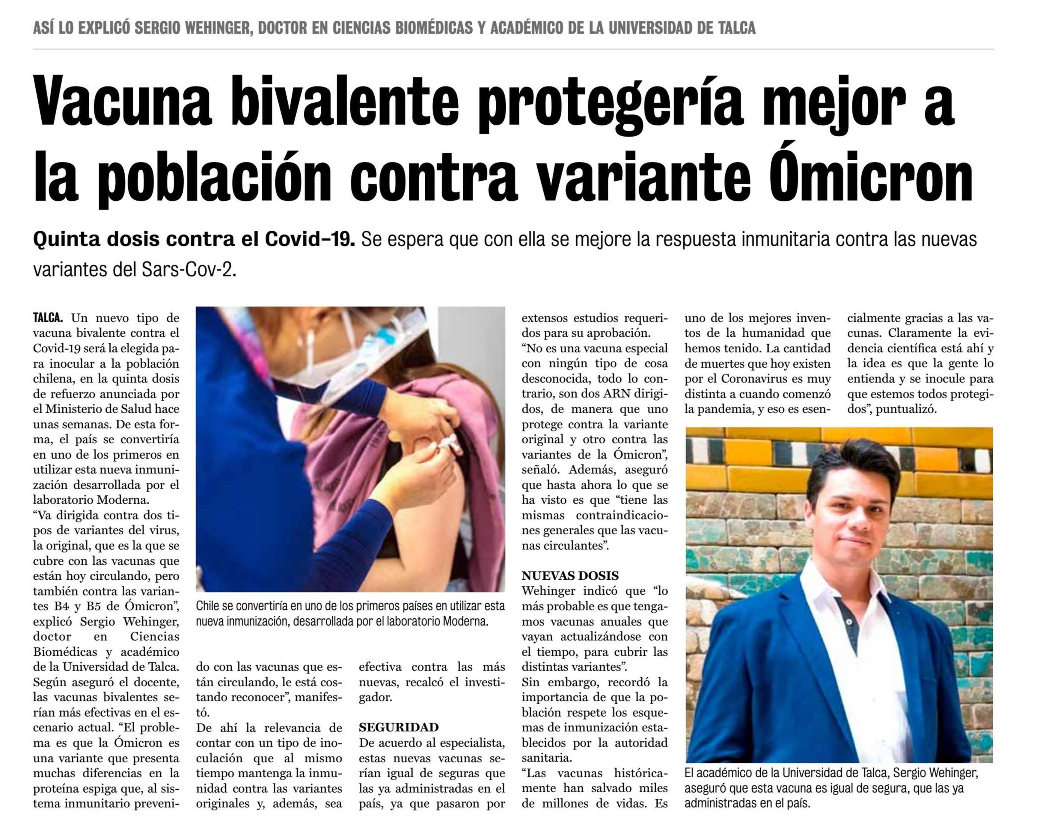 Vacuna bivalente protegería mejor a la población contra variante Ómicron. Se refiere Sergio Wehinger, director del Magíster en Ciencias Biomédicas.