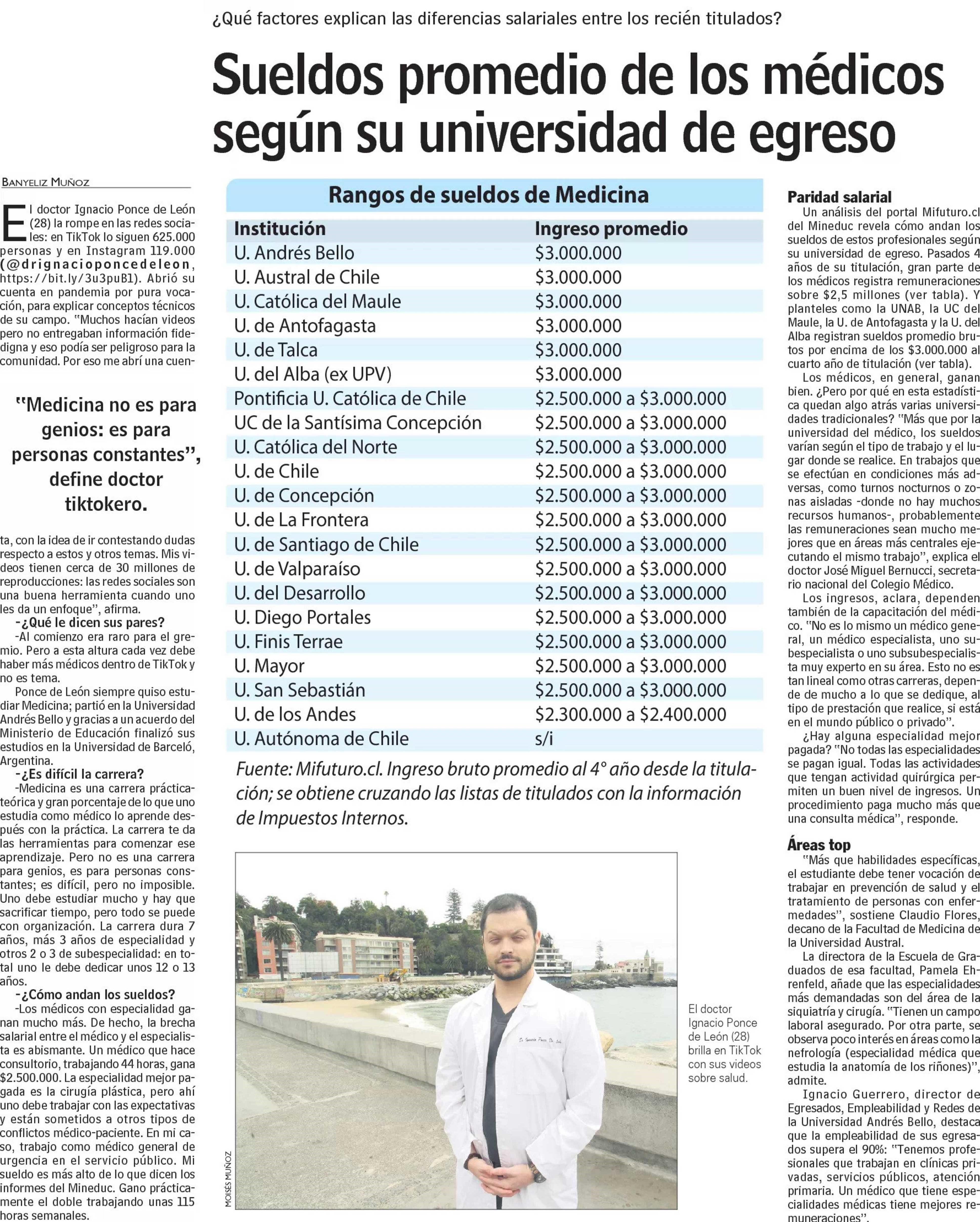 Sueldos promedio de los médicos según su universidad de egreso. Se menciona a la UTalca.