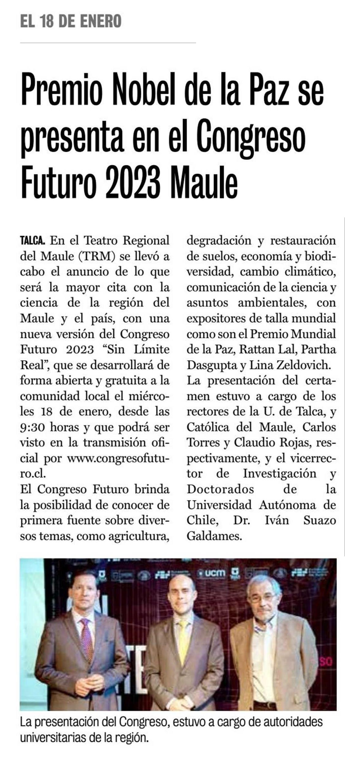 Premio Nobel de la Paz se presenta en el Congreso Futuro 2023 Maule.