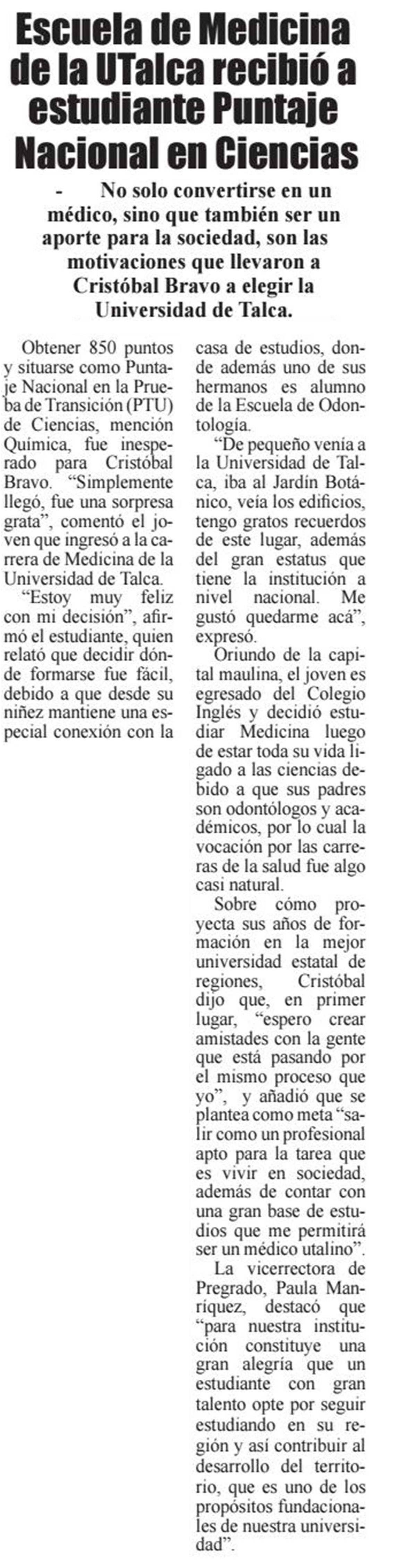 Escuela de Medicina de la UTalca recibió a estudiante Puntaje Nacional en Ciencias.