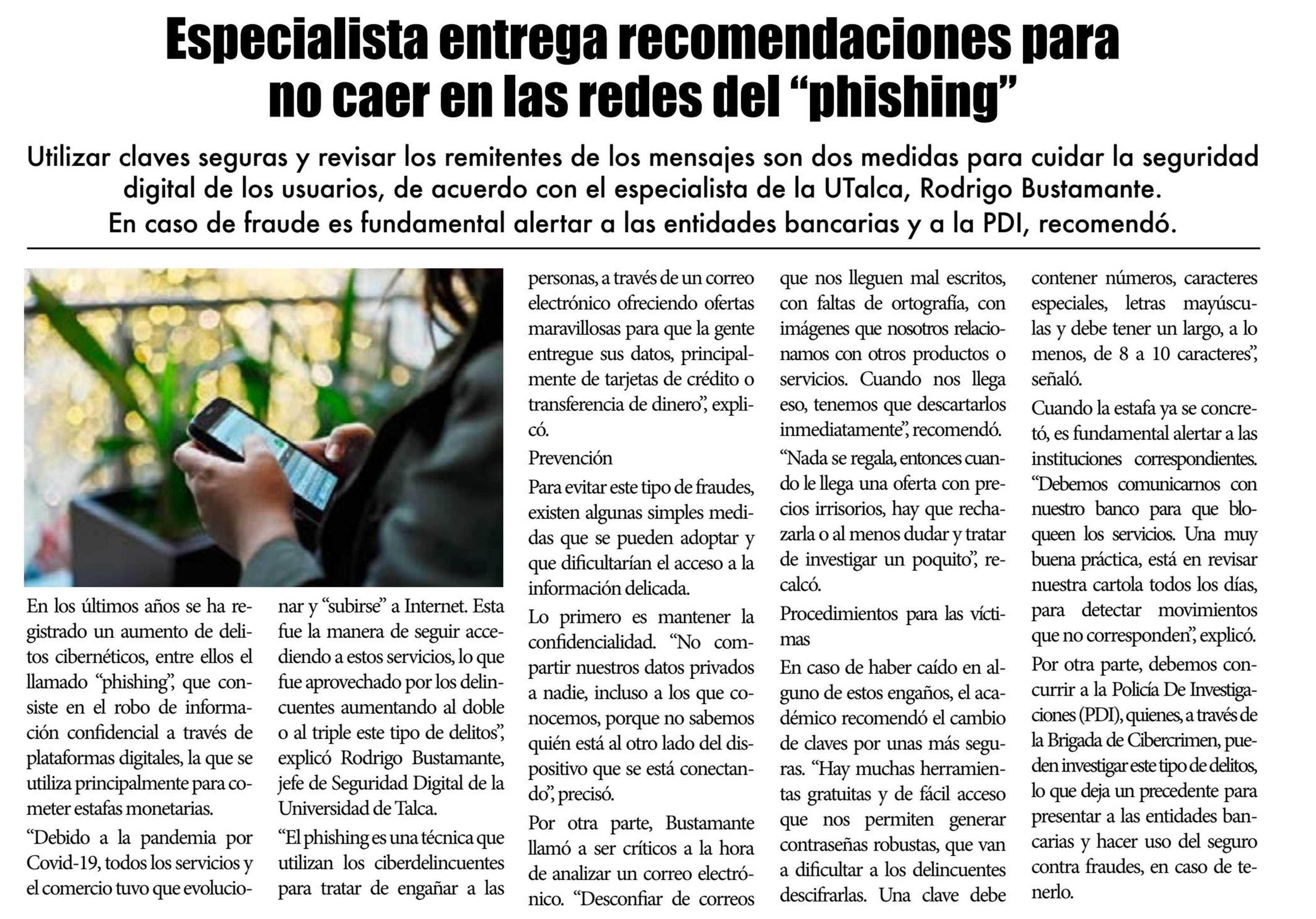 Especialista entrega recomendaciones para no caer en las redes del “phishing”. Se refiere Rodrigo Bustamante González, jefe de la Unidad de Seguridad Digital.