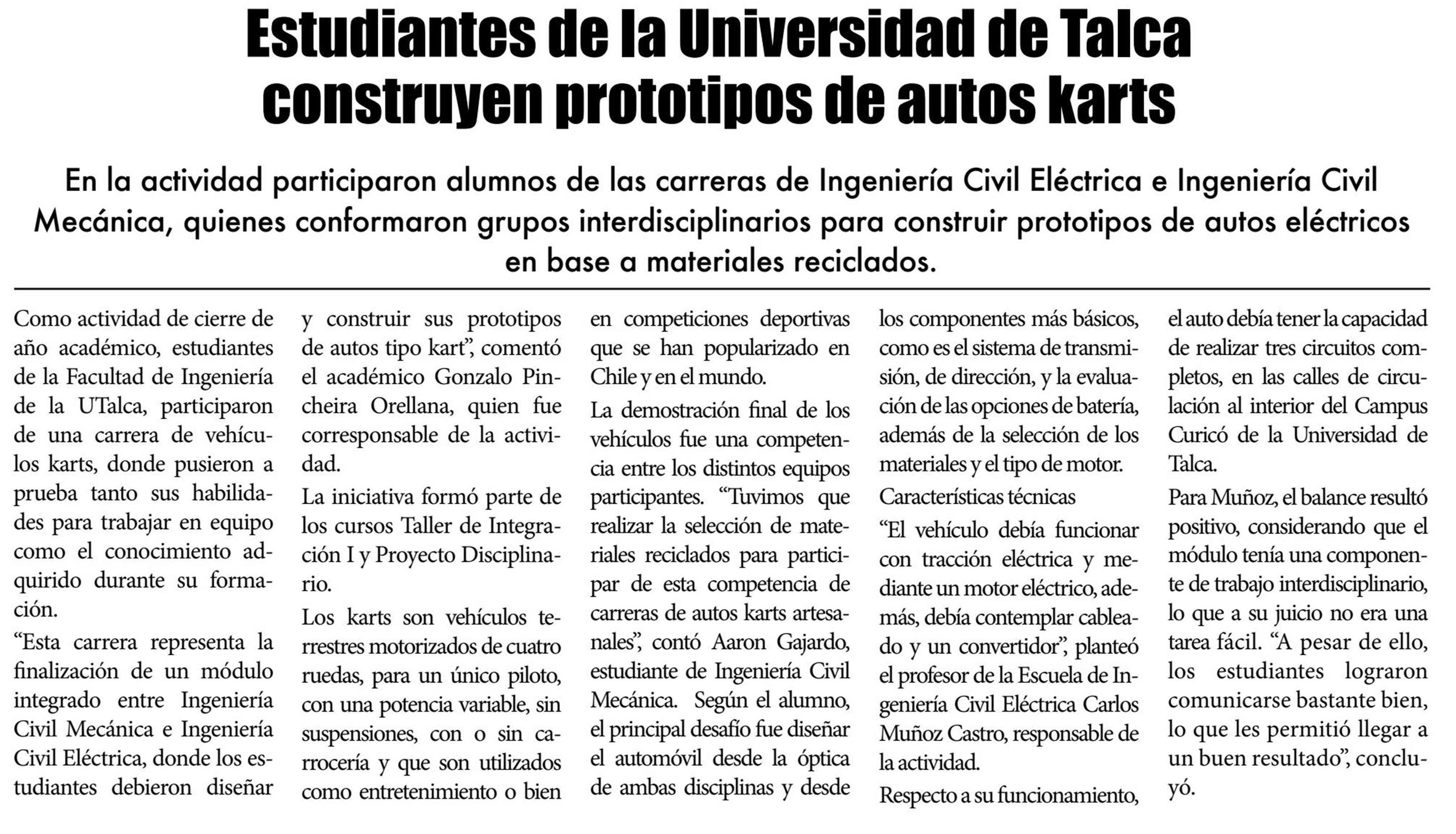 Estudiantes de la Universidad de Talca construyen prototipos de autos karts. Se refieren Gonzalo Pincheira Orellana y Carlos Muñoz Castro, académicos de la Facultad de Ingeniería y Aaron Gajardo, estudiante de Ingeniería Civil Mecánica.