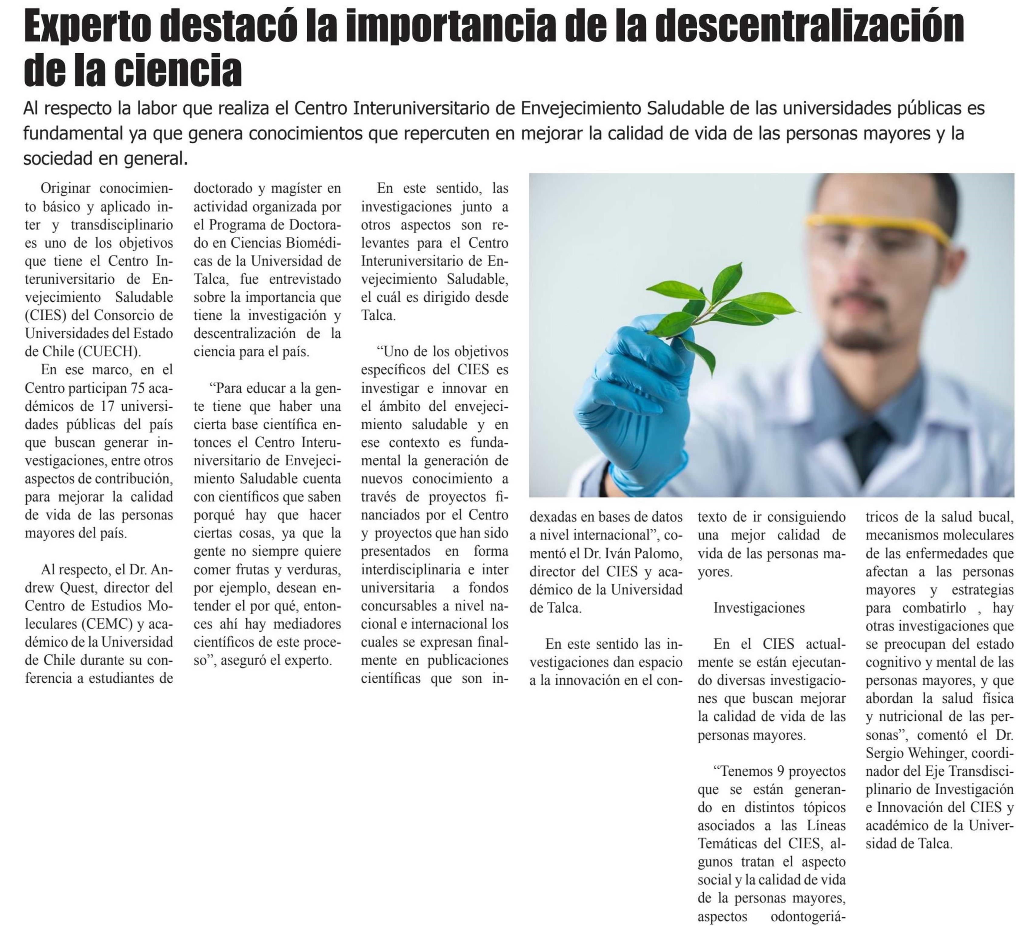 Experto destacó la importancia de la descentralización de la ciencia. Se refiere Iván Palomo González, académico de la Facultad de Ciencias de la Salud.