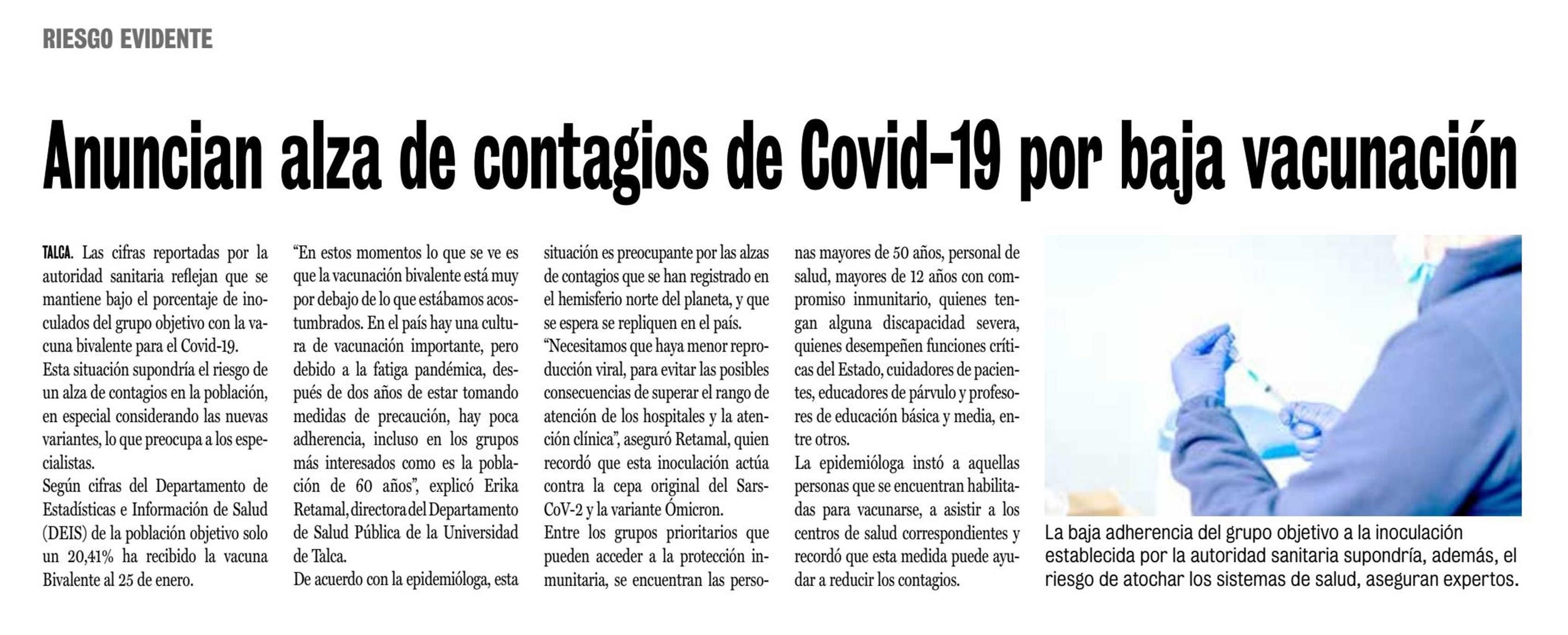 Baja vacunación bivalente generaría una posible alza de contagios. Se refiere Érika Retamal Contreras, directora del Departamento de Salud Pública.