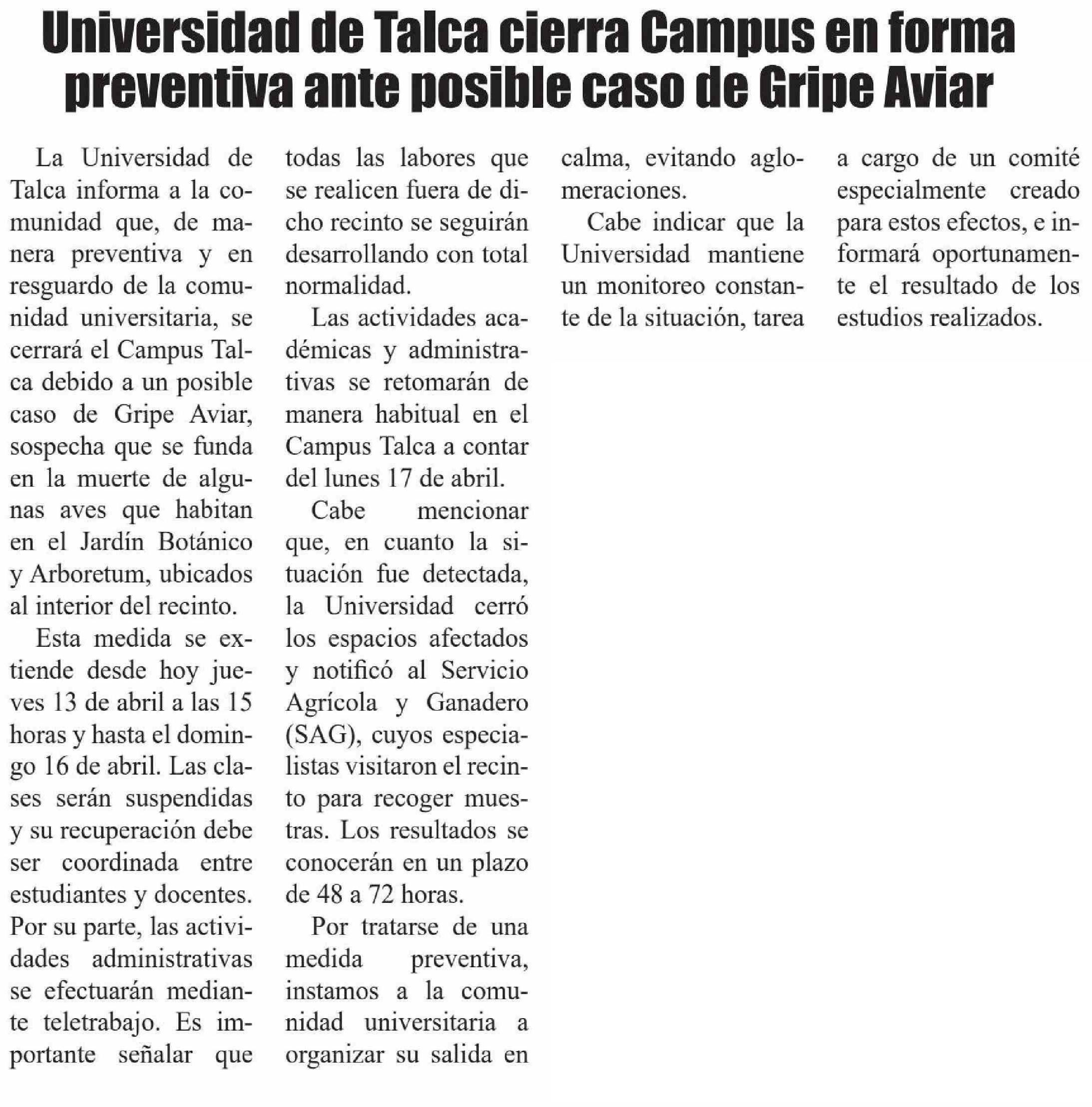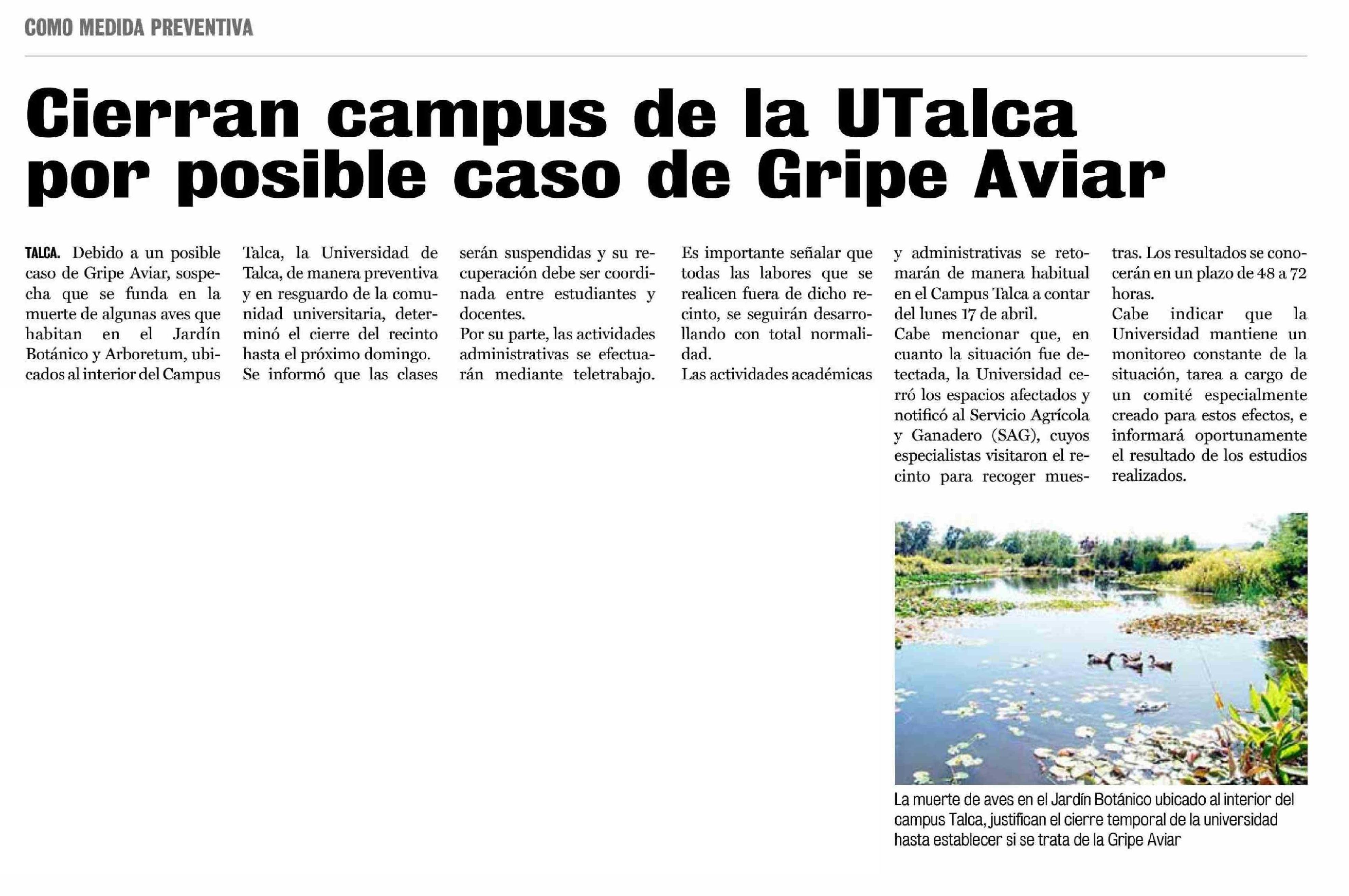 Cierran campus de U. De Talca por posible gripe aviar.