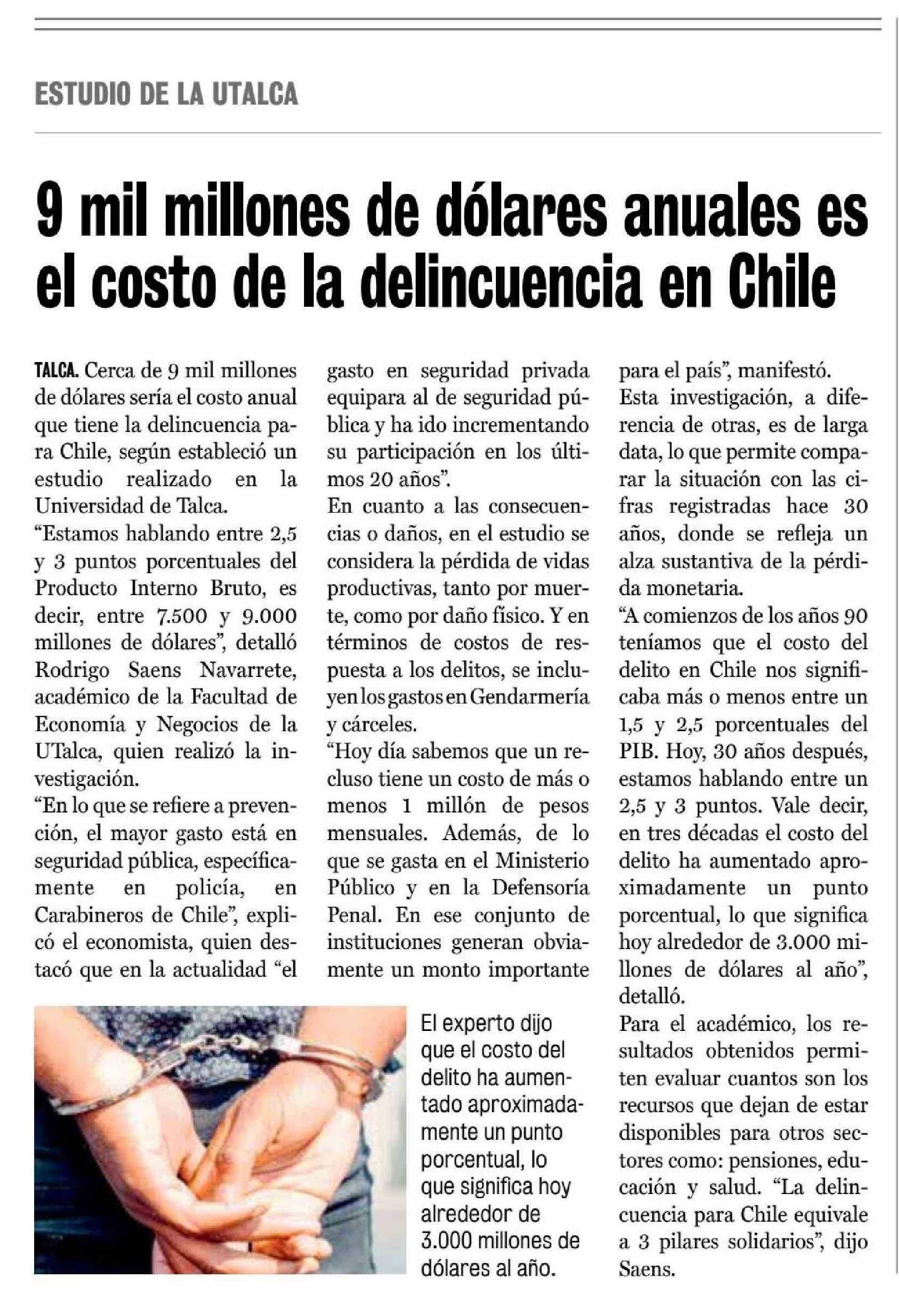 Estudio UTalca indica que costo aproximado de la delincuencia en Chile se acerca a nueve mil millones de dólares anuales. Se refiere Rodrigo Saens Navarrete, académico de la Facultad de Economía y Negocios (FEN).