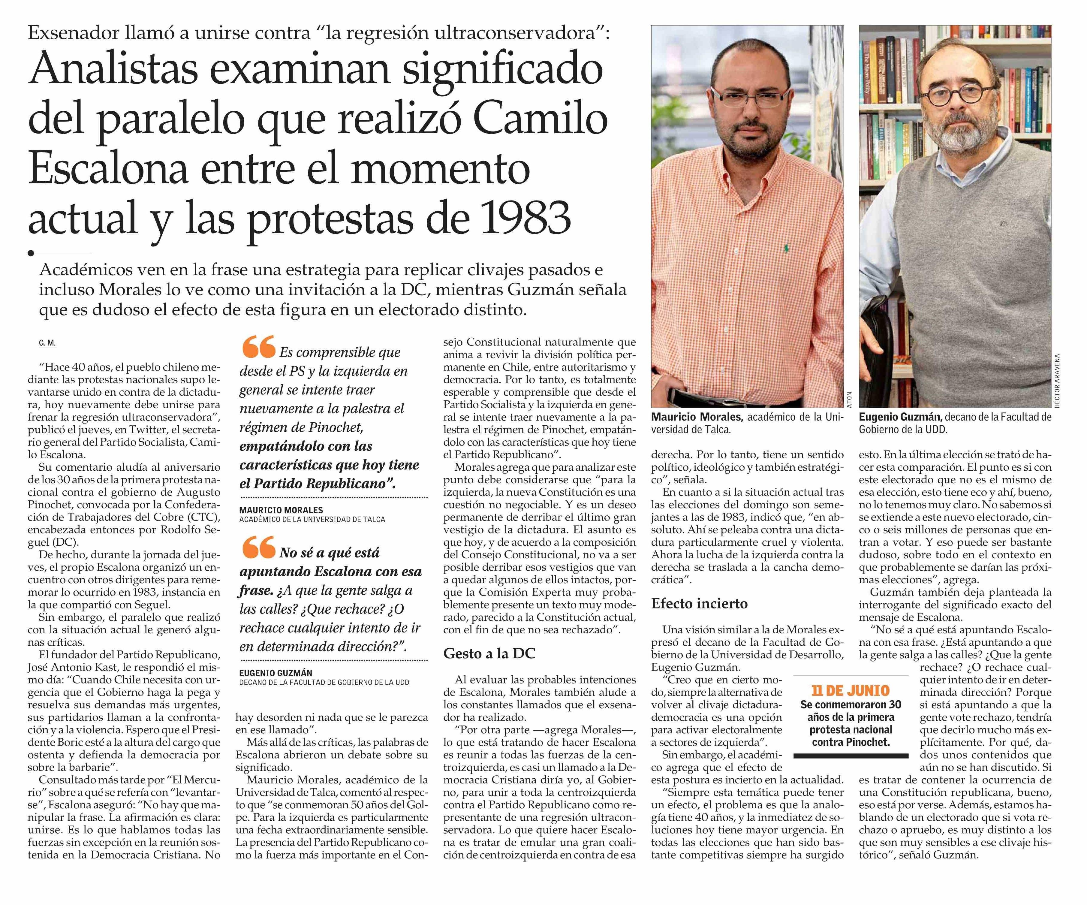 Analistas examinan significado del paralelo que realizó Camilo Escalona entre el momento actual y las protestas de 1983. Se refiere Mauricio Morales Quiroga, director del Centro de Análisis Político (CAP).