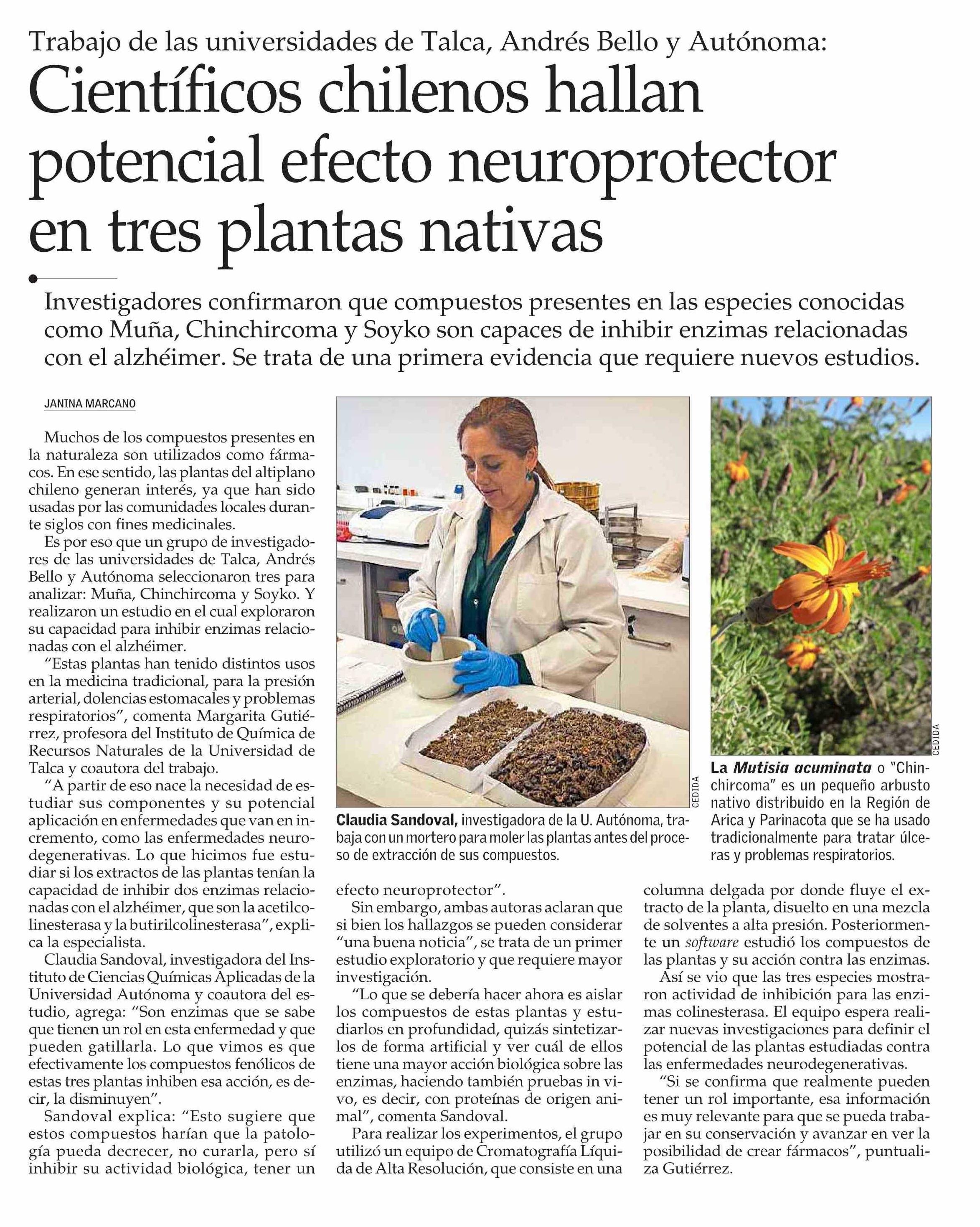 Científicos chilenos hallan potencial efecto neuroprotector en tres plantas nativas. Se refiere Margarita Gutiérrez Cabrera, académica e investigadora del Instituto de Química de Recursos Naturales.