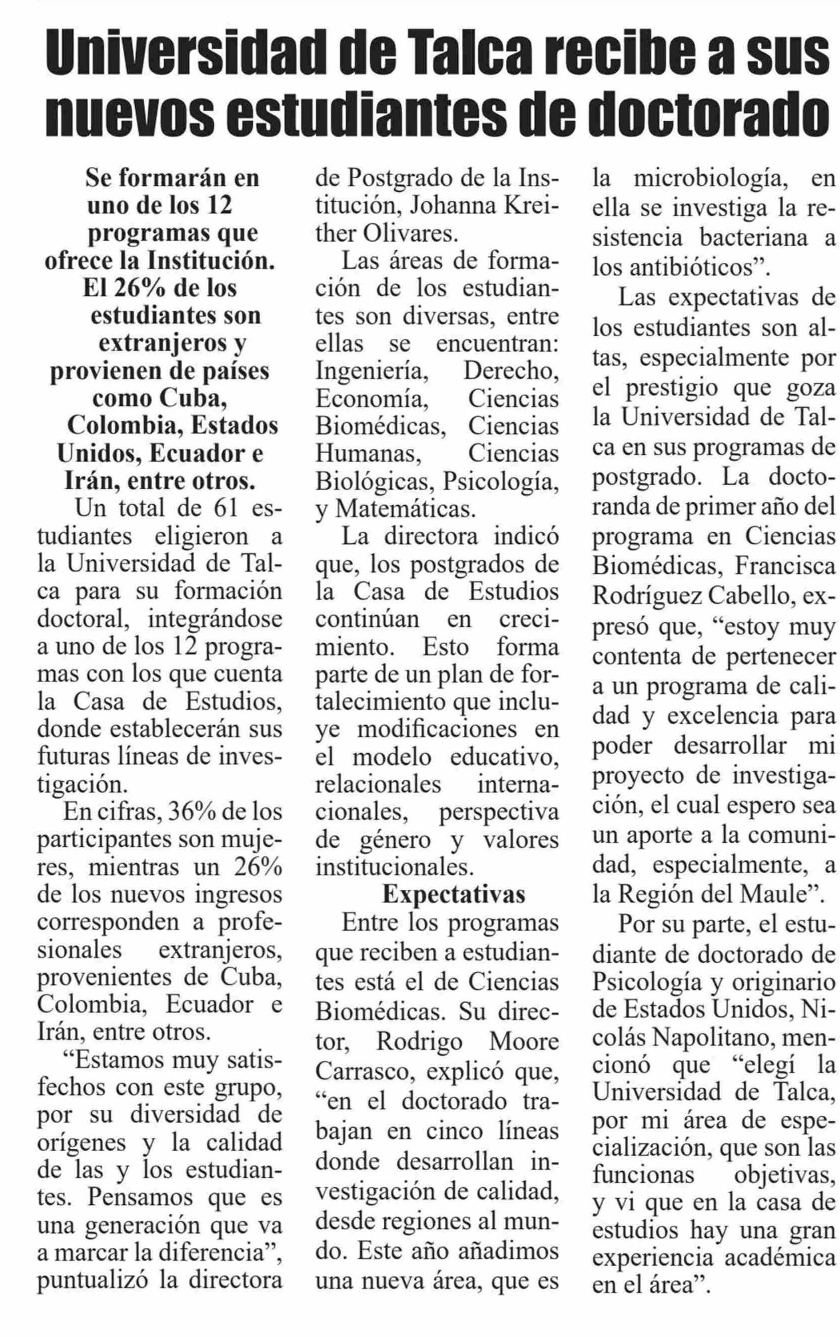 Breves regionales. Se menciona la Universidad de Talca.
