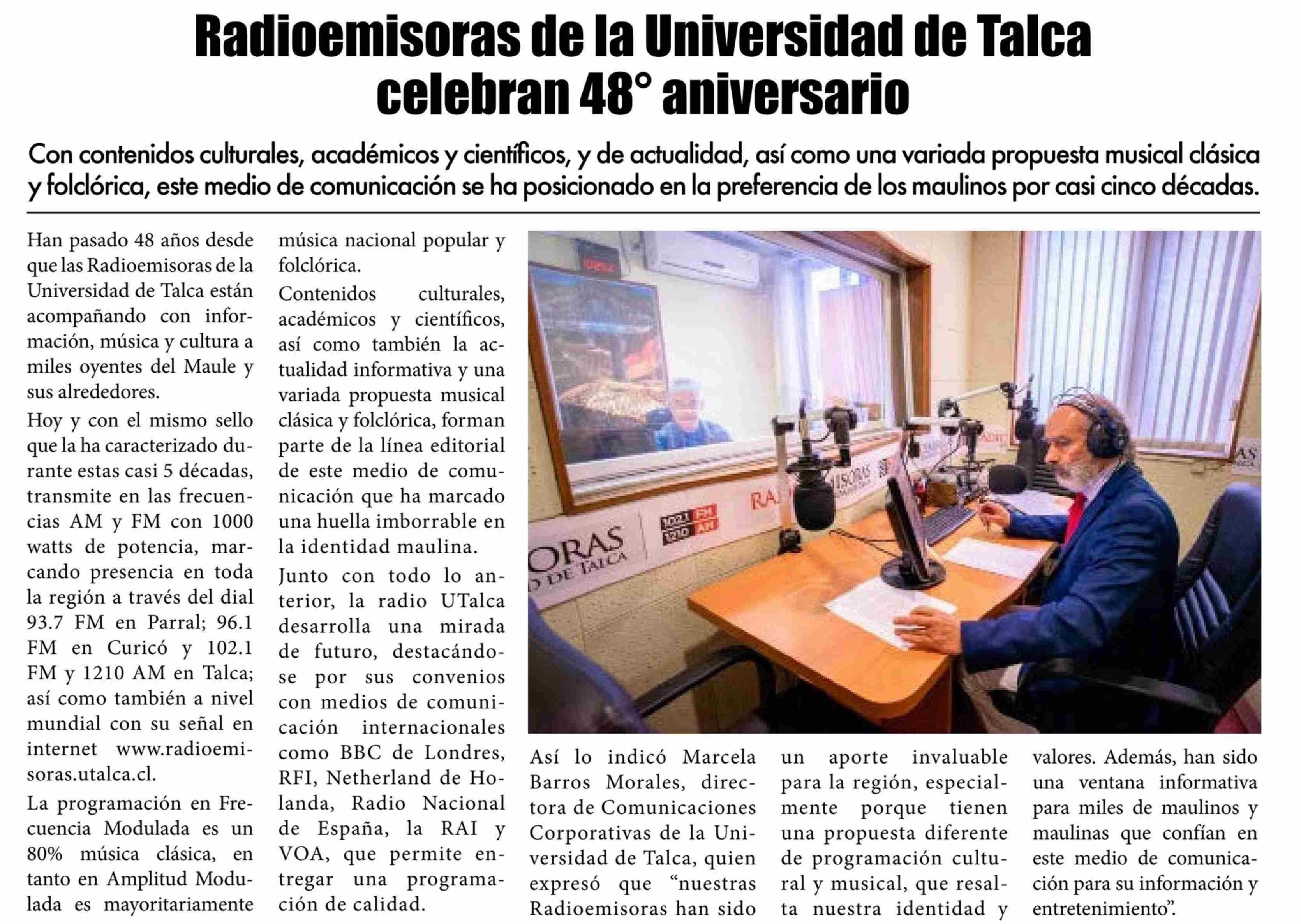 Radioemisoras de la UTalca de aniversario. Se menciona a la Universidad de Talca.