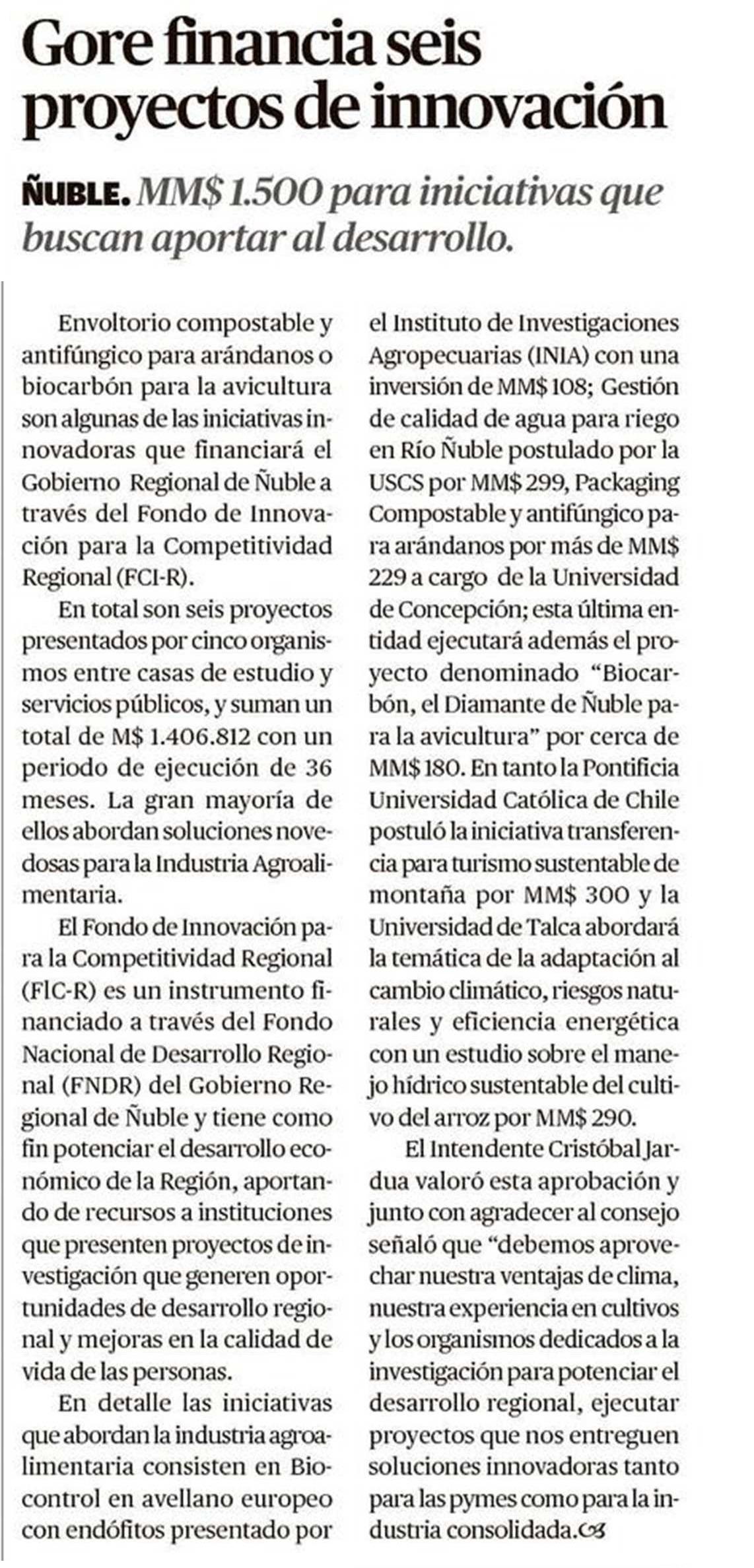 Gore financia seis proyectos de innovación. Se menciona a la UTalca.