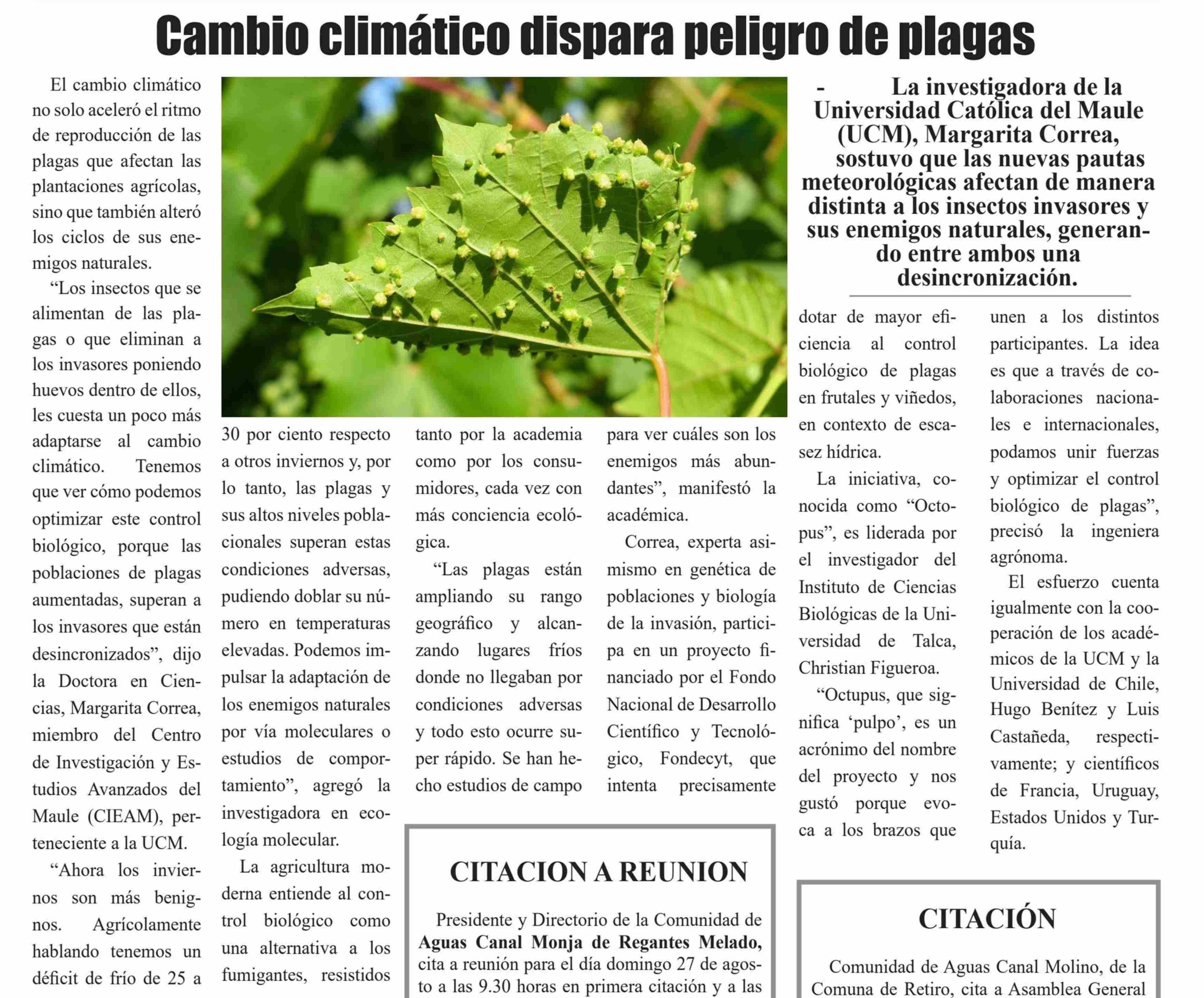 Cambio climático dispara peligro de plagas. Se menciona a Cristian Figueroa, investigador del Instituto de Ciencias Biológicas.