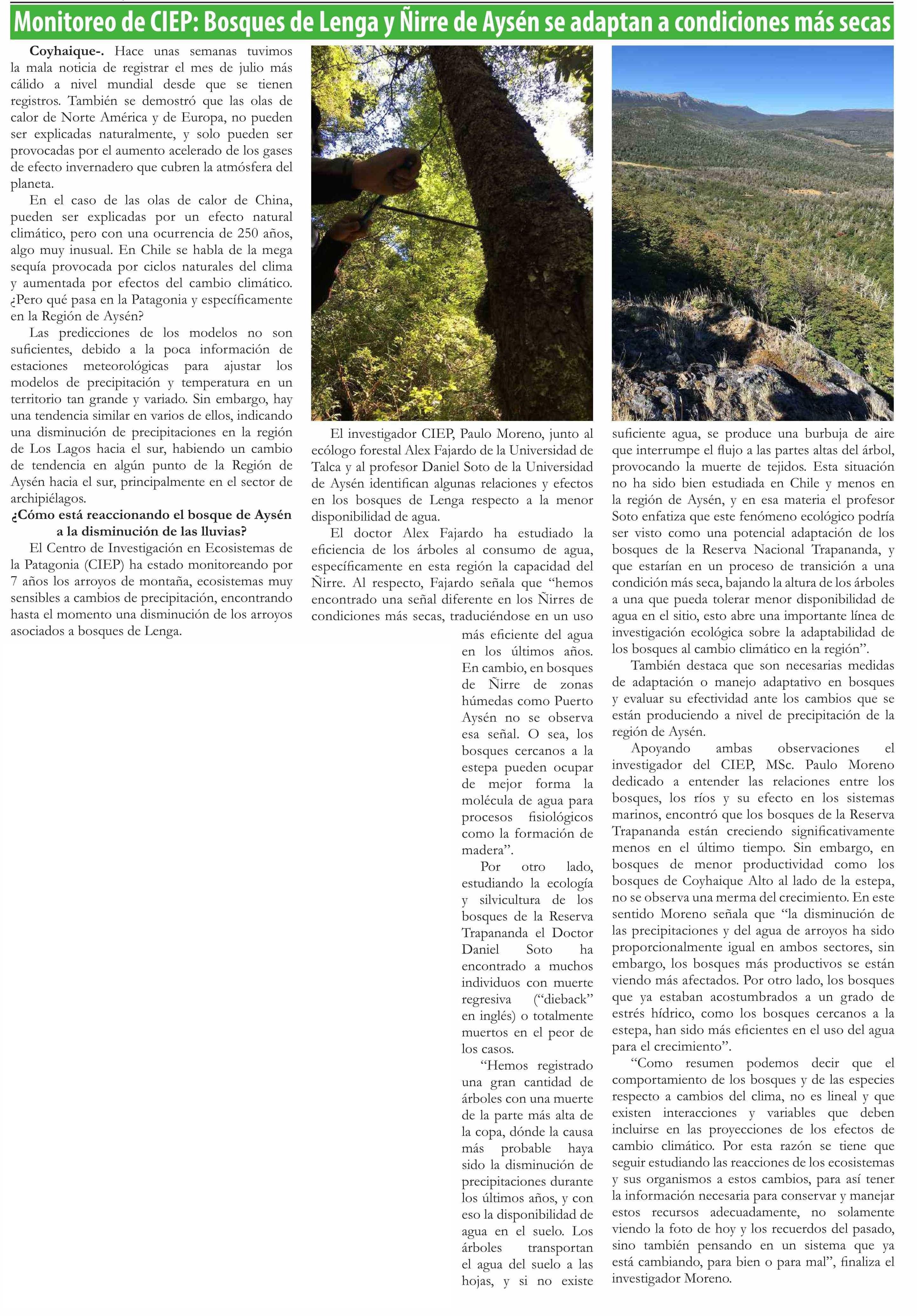 Monitoreo de CIEP: Bosques de Lenga y Ñirre de Aysén se adaptan a condiciones más secas. Se menciona a Alex Fajardo ecólogo forestal.