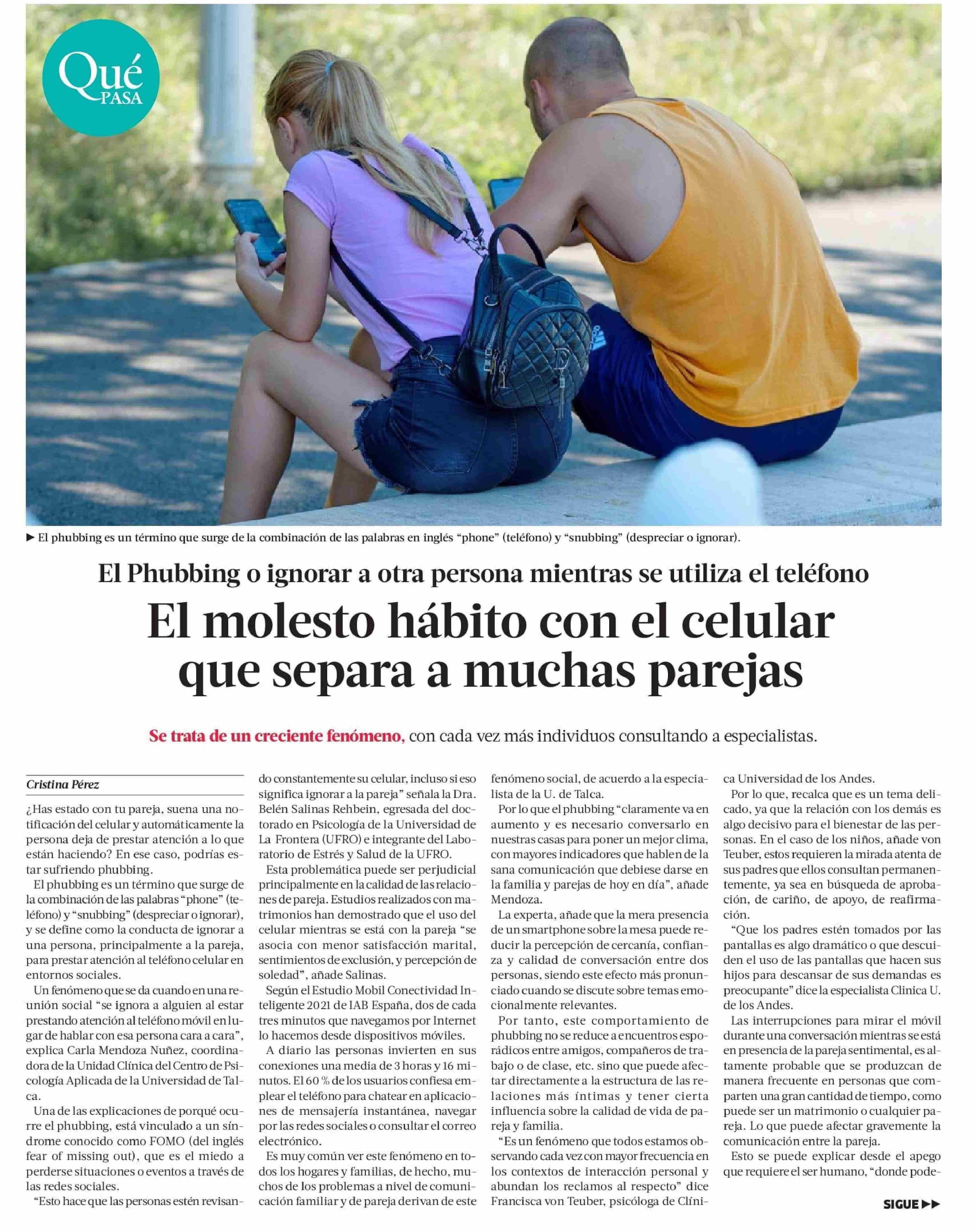 ¿Qué es el Phubbing? El molesto hábito con el celular que está separando a muchas parejas. Se refiere Carla Mendoza Núñez, coordinadora de la Unidad Clínica del Centro de Psicología Aplicada.