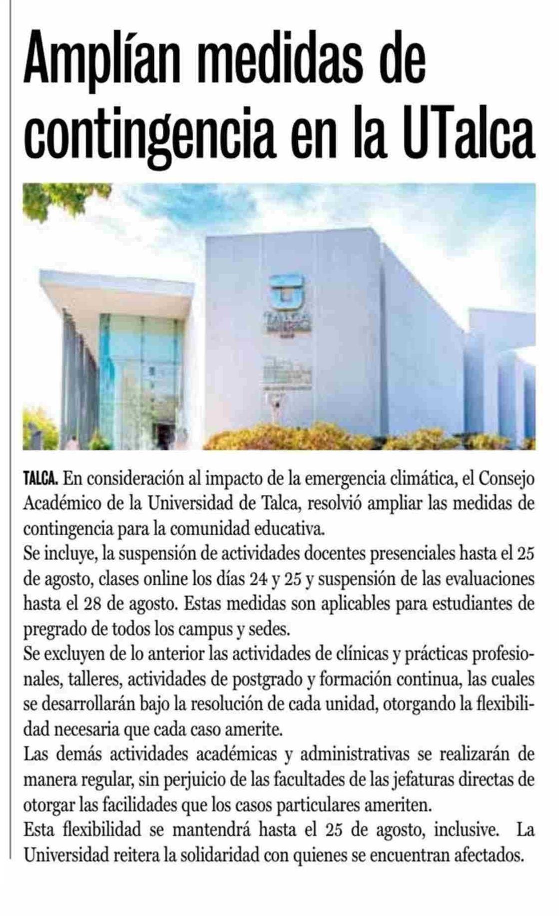 Amplían medidas de contingencia en la UTalca. Se menciona al Consejo de Académico.