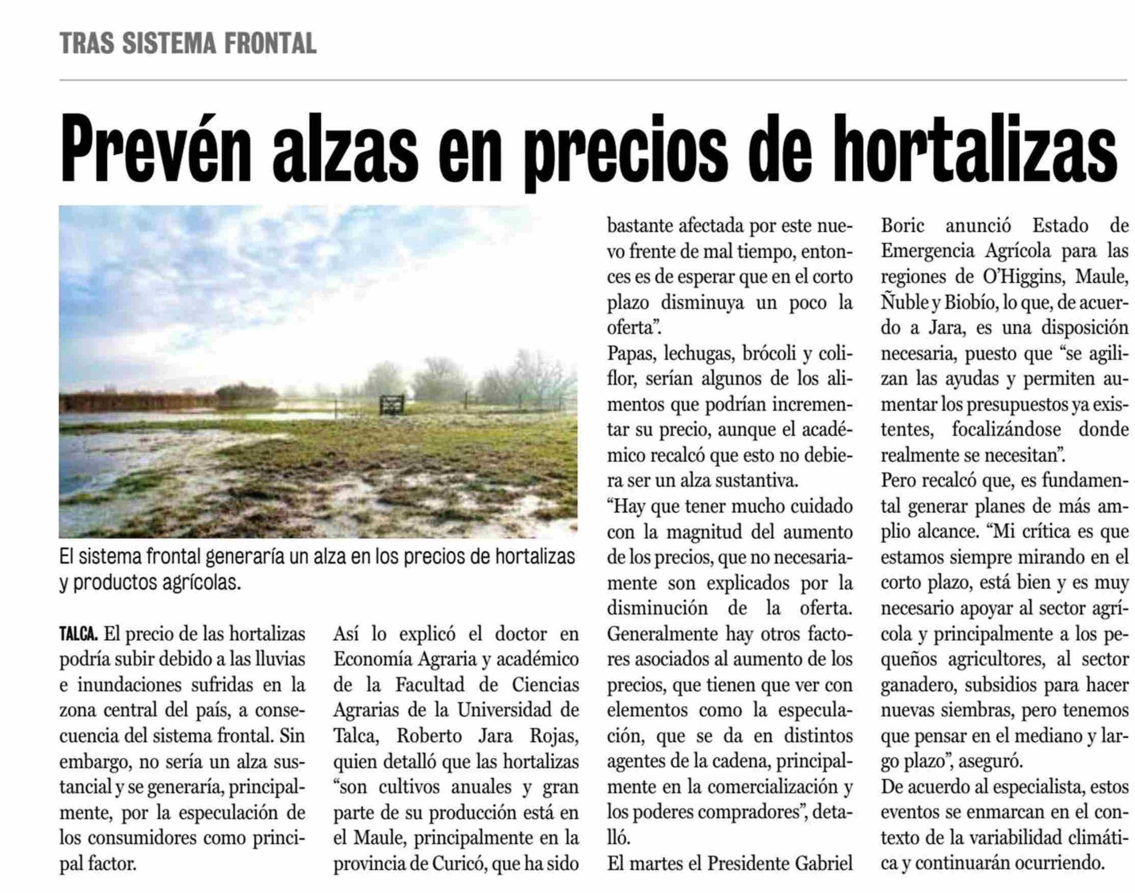 Efectos del temporal en el alza de precios de las hortalizas. Se refiere Roberto Jara, académico de la Facultad de Ciencias Agrarias.