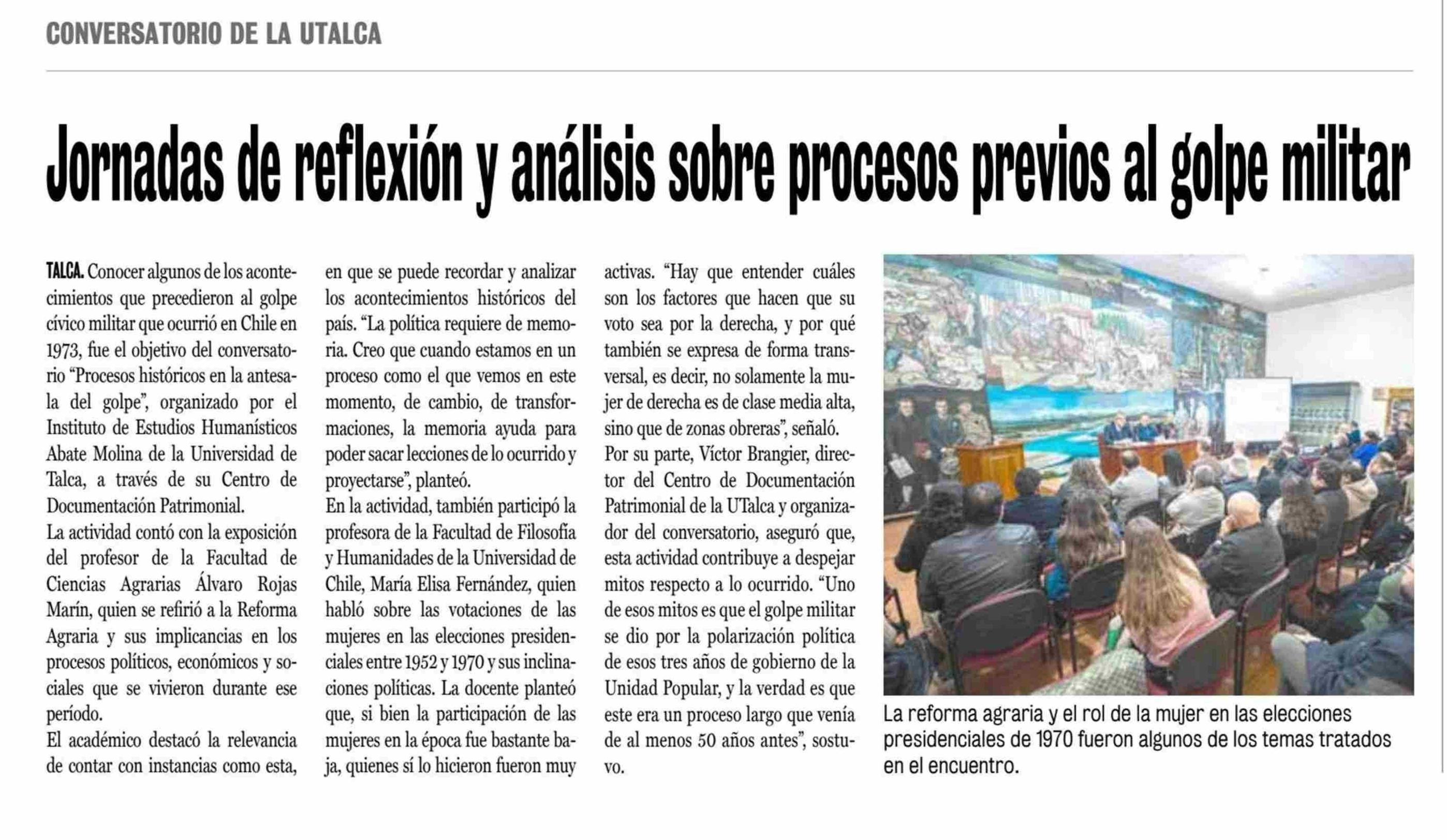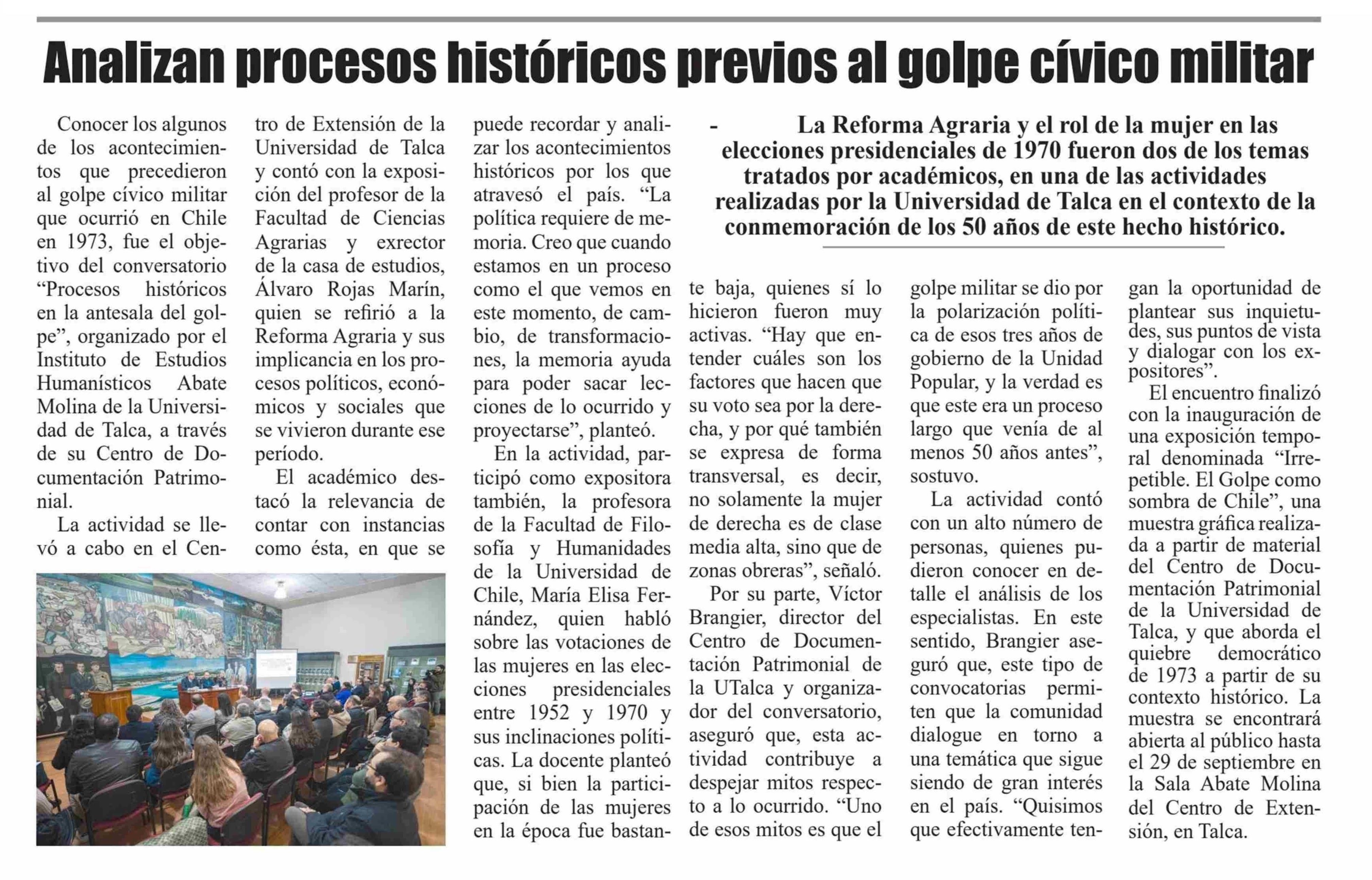 Analizan procesos históricos previos al golpe cívico militar. Se refiere Álvaro Rojas Marín, exrector y académico de la Facultad de Ciencias Agrarias y Victor Brangier, director del Centro de Documentación Patrimonial.