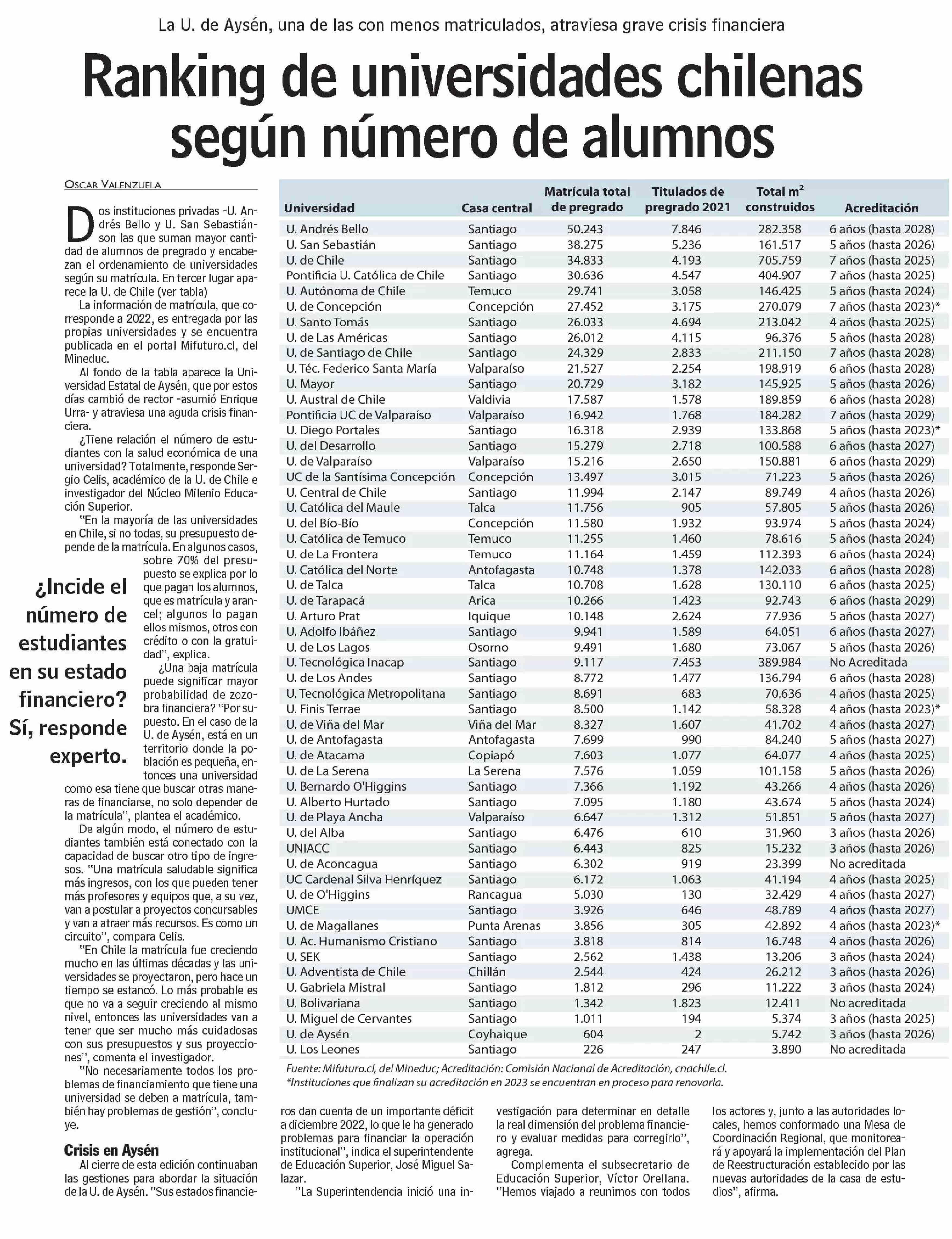 Ranking de universidades chilenas según número de alumnos. Se menciona a la Universidad de Talca.