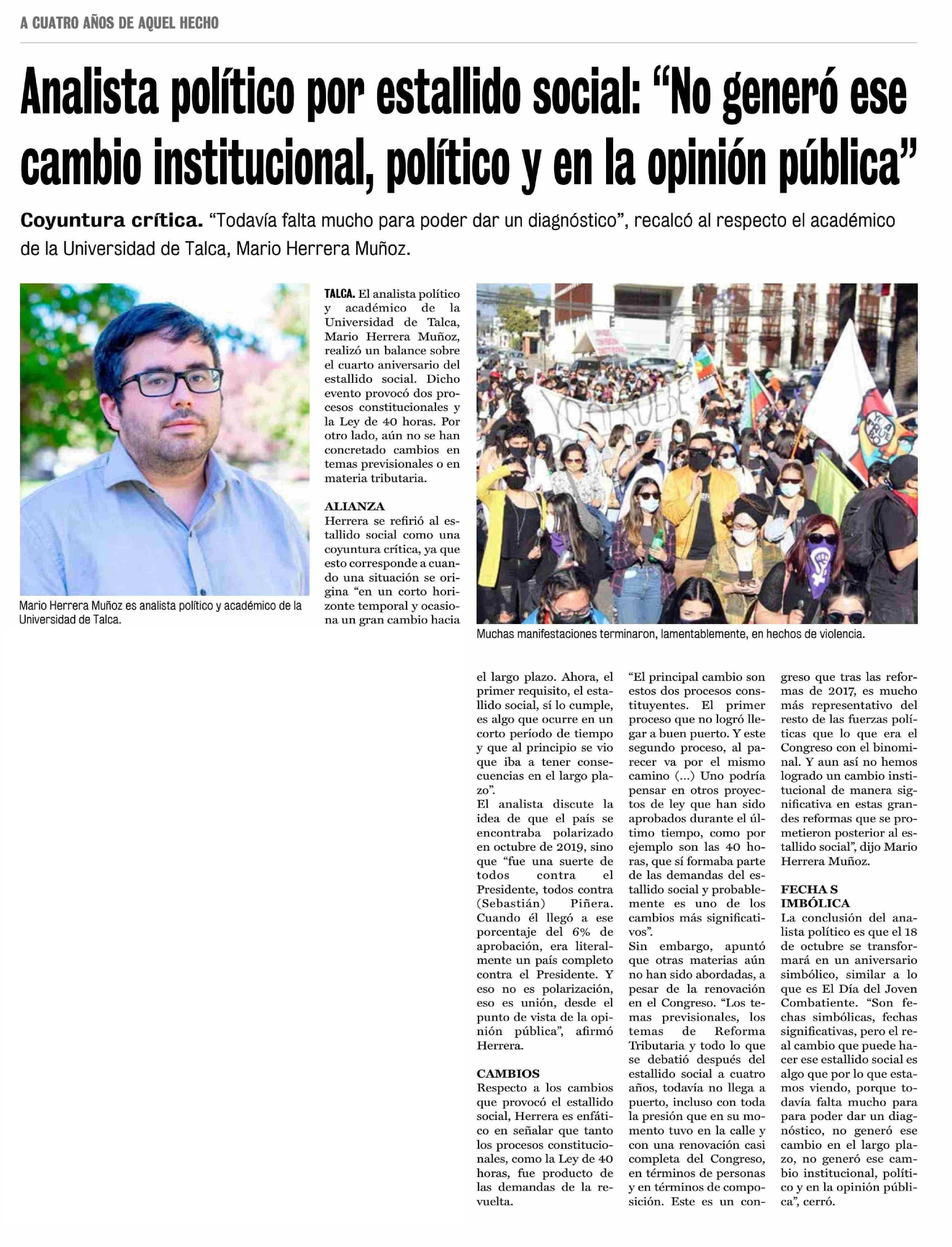 Analista político por estallido social: “No generó ese cambio institucional, político y en la opinión pública”. Se refiere Mario Herrera, académico e investigador del Centro de Análisis Político (CAP).