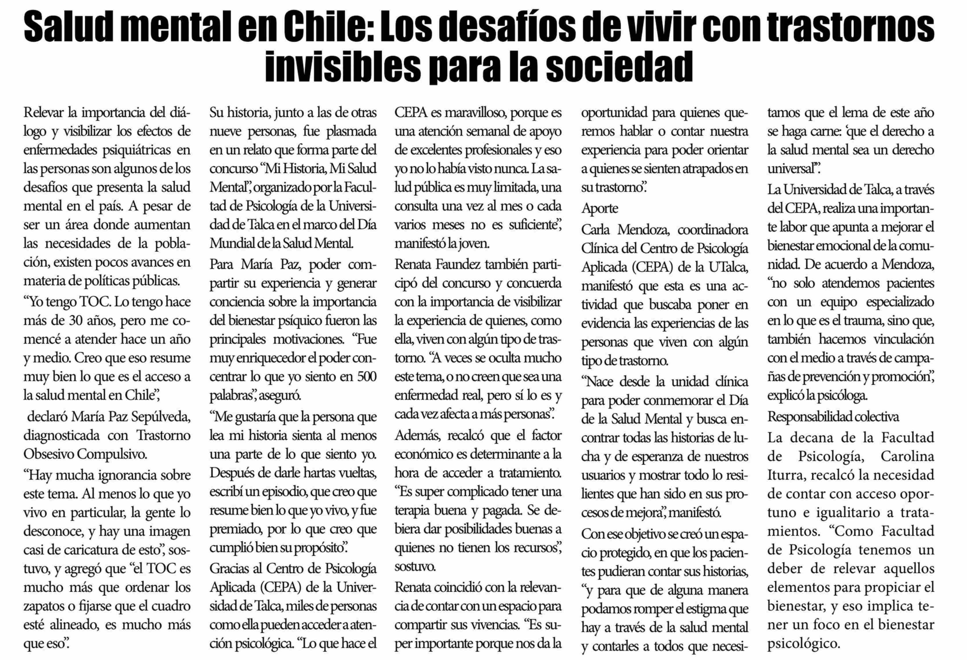 Salud mental en Chile: Los desafíos de vivir con trastornos invisibles para la sociedad. Se refiere Carla Mendoza Núñez, coordinadora clínica del Centro de Psicología Aplicada (CEPA).