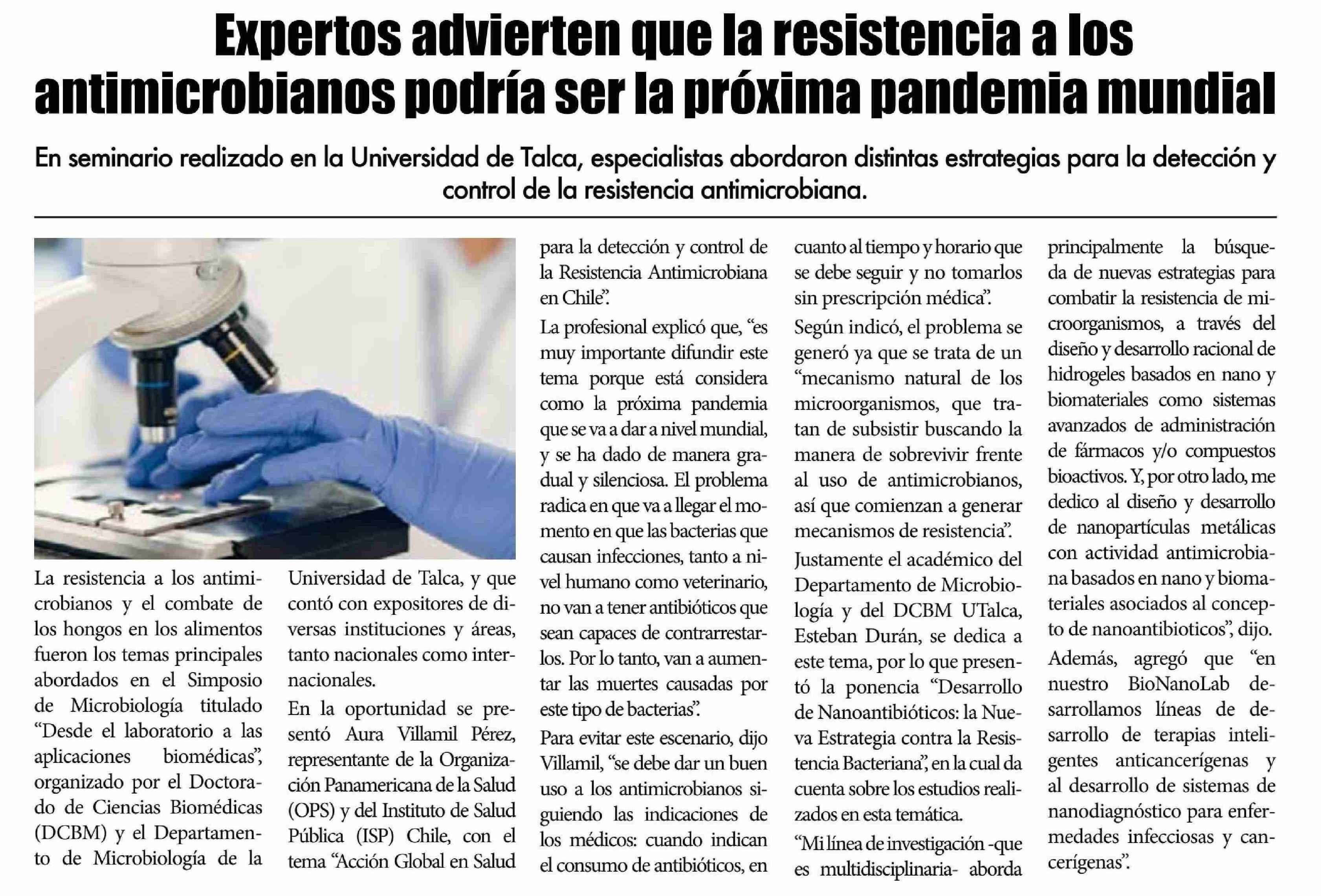 Experta chilena advierte que la resistencia a los antimicrobianos podría ser la próxima pandemia mundial. Se menciona a Doctorado de Ciencias Biomédicas (DCBM) y el Departamento de Microbiología de la Universidad de Talca.