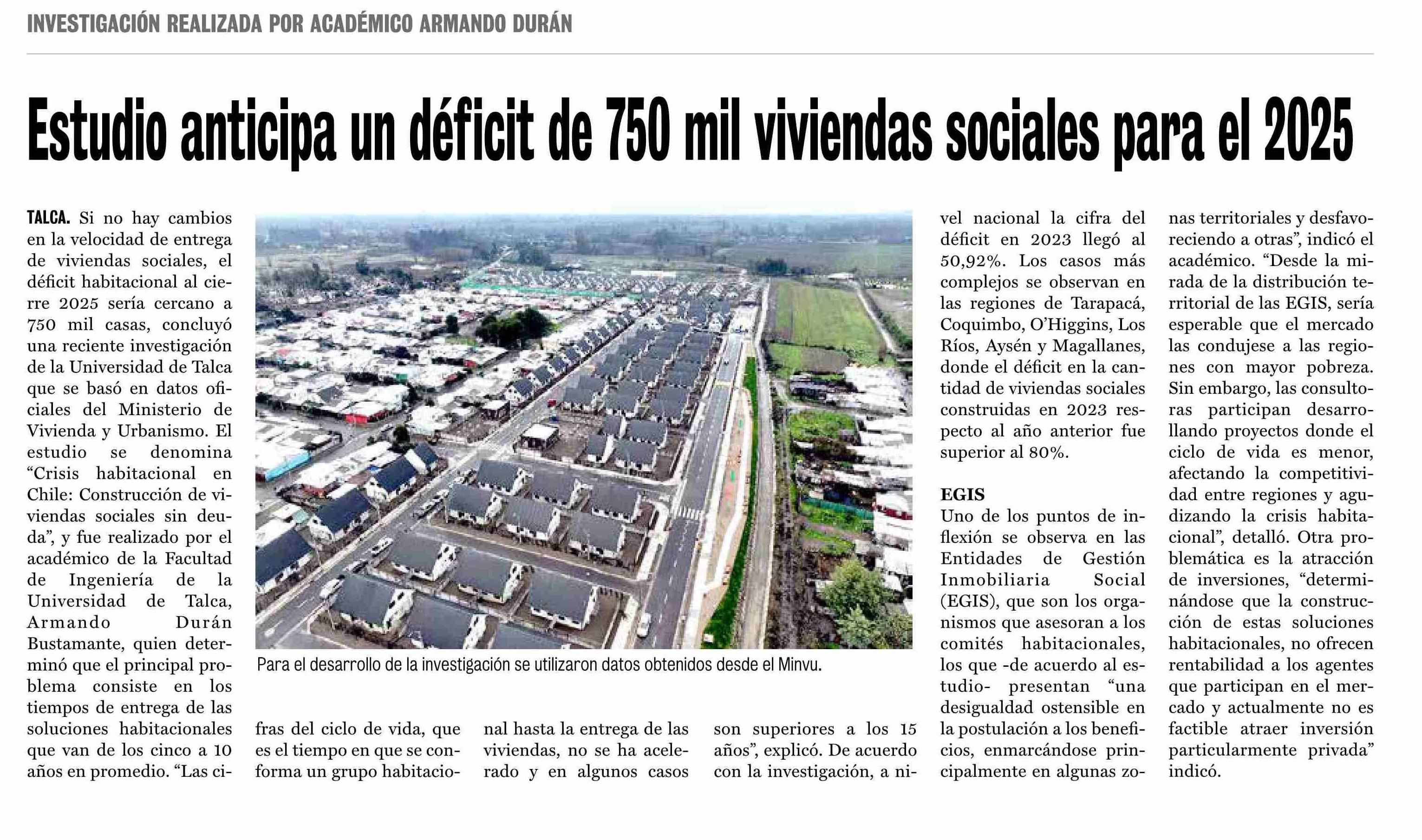 Estudio de la UTalca: En 2025 habría un déficit de 750 mil viviendas sociales. Se refiere Armando Durán, académico Facultad de Ingeniería.